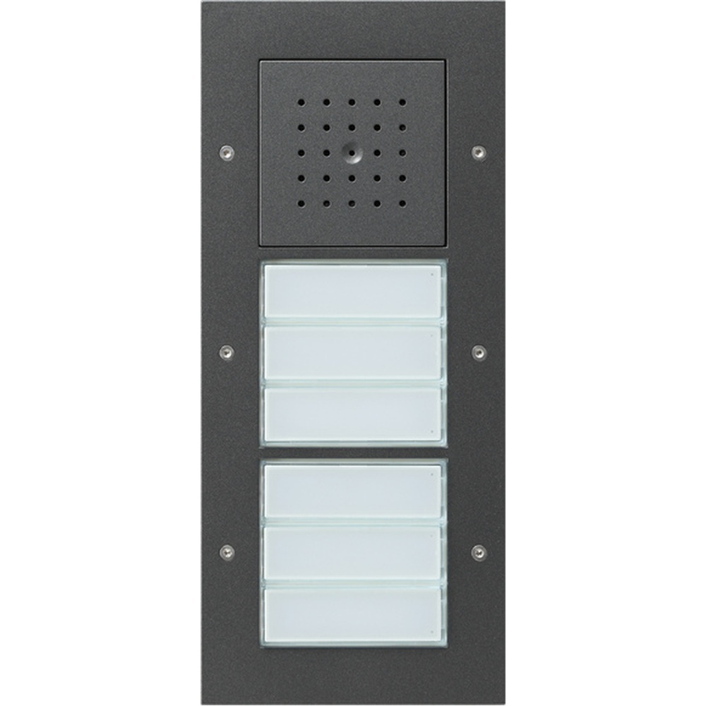 Gira Türstation AP 6fach 126867 Türstation AP 6f Türko Anthrazit Türstation mit Türlautsprecher und Ruftaster als komplett vormontierte Einheit für die senkrechte Aufputz Montage. Nicht benötigte Ruftasten lassen sich mit der Ruftastenabdeckung 1255 .. abdecken. Die Türstation AP hat folgende Produktmerkmale: Komplett vormontierte Aufputz Türstation, dadurch schnelle und saubere Installation.. Im Design des Gira Schalterprogramms TX_44.. Geringe Bauhöhe von nur 19 mm.. Verwindungssteifes Aufputzgehäuse durch Aluminiumprofil.. Abdeckrahmen aus bruchsicherem Thermoplast mit hoher UV Stabilität sowie einer kratzfesten, pflegeleichten Oberfläche.. Diebstahlschutz mittels Torx Schrauben.. Signalübertragung und Versorgung der Audio und Video Komponenten über den verpolungssicheren und kurzschlussfesten 2 Draht Bus.. In Türkommunikationsanlagen bis zu 30 Teilnehmern einsetzbar.. Einmann Inbetriebnahme durch einfache Inbetriebnahmeprozedur.. Wetterfester Lautsprecher.. Hochwertiges Elektretmikrofon.. Freisprechfunktion Sprachgesteuertes Gegensprechen mit Echo und Hintergrund Geräuschunterdrückung .. Akustisches Quittiersignal bei Ruftastenbetätigung.. Sprachlautstärke einstellbar.. Weiße Ruftastenbeleuchtung in LED Technologie. Durch die wartungsfreie und stromsparende LED Technologie wird eine gleichmäßige, gut sichtbare Ruftastenausleuchtung erreicht.. Spritzwasserdichte Ruftastenabdeckung aus schlagfestem Kunststoff.. Namensschild des Ruftasters ohne Werkzeug und ohne Rahmendemontage austauschbar.. Professionelle Beschriftung über den Gira Beschriftungsservice www.beschriftung.gira.de oder die Gira Beschriftungssoftware... Spannungsversorgung: DC 26 V + 2 V Busspannung Anschlüsse: 2 Schraubklemmen 2 Draht Bus 2 Schraubklemmen Zusatzversorgung Abmessungen: 1fach, 3fach BxHxT 110x181x19 mm 6fach BxHxT 110x253x19 mm Abmessung Namensschilder: BxH 62x18 mm Temperaturbereich 25 C bis +70 C Schutzart: IP44 EAN Nr. 4010337003908 Warengruppe Gira Türkommunikation