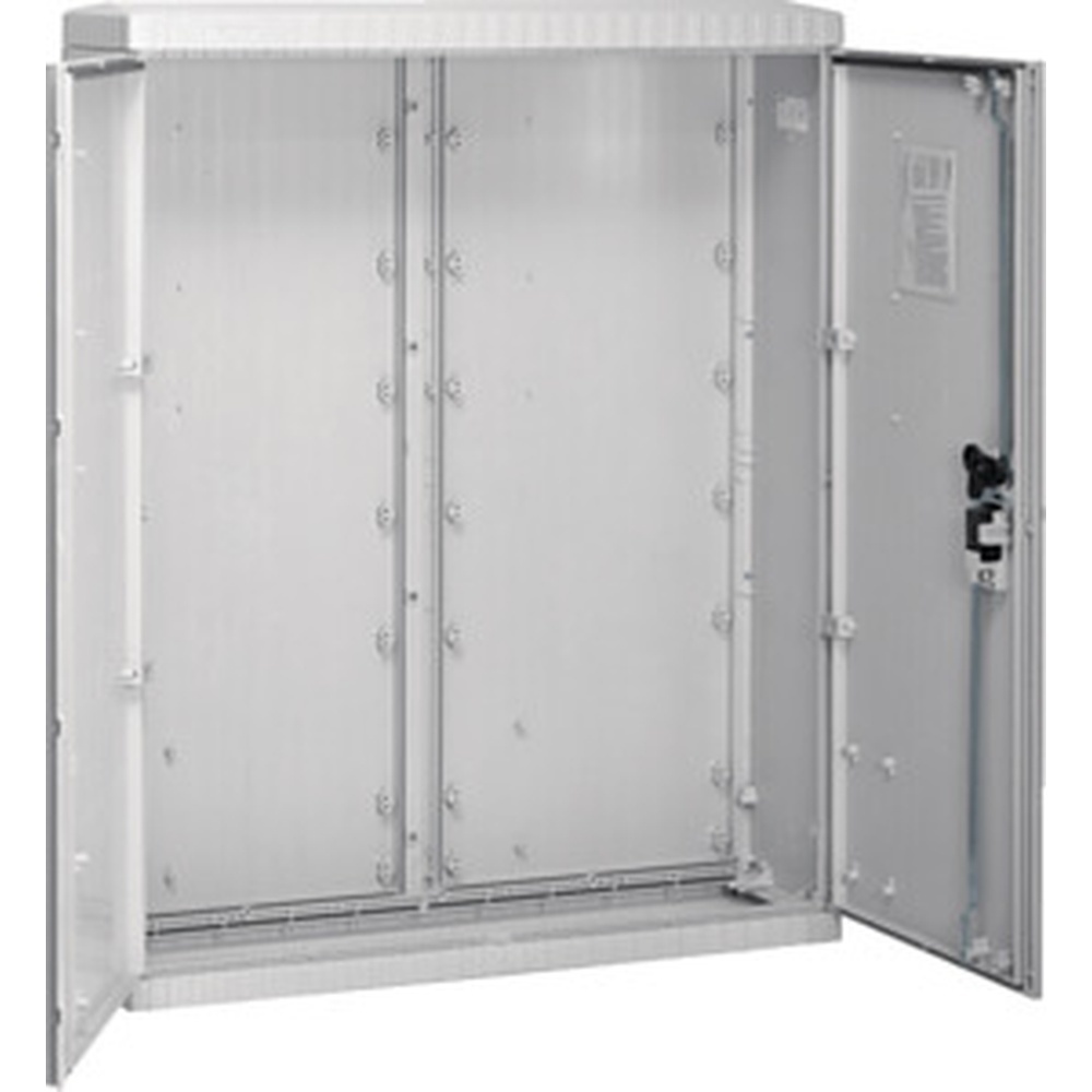 Hager Kabelverteilerschrank ZAL132 Kabelverteilerschrank Gr.2/1355, leer Kabelverteilerschrank Gr.2/1355, leer, 1355x1110x315mm (HxBxT).Kabelverteilerschrank nach DIN EN 61439, Schutzart IP 44, aus glasfaserverstärktes Polyester FS 833.5 nach DIN EN 14598. Kabelverteilerschrank als Leerschrank, Schrank mit Montageplatte (PVC) oder Schrank mit Sammelschienen-System zum Einbau von NH-Sicherungslastschaltleisten. Profiliertes Gehäuse im Rippendesign. Tür mit Öffnungswinkel 180 Grad bei freiem Stand und 90 Grad bei angereihten Gehäusen. Rechte Tür ist aushängbar. Schließung mit Schwenkhebel, Drei-Punkt-Basküleverschluss, Doppelschließung, ein Profilhalbzylindern ist eingebaut. Schränke der Größe 2 können mit zwei voneinander unabhängig verschließbaren Türen versehen werden. Die Belüftung erfolgt über labyrinthartig ausgebildete Lüftungskanäle und ist durch Eindringen von Fremdkörpern stochersicher. Hinweis: Kabelverteilerschrank kann je nach Ausführung mit Eingrabsockel, Bodenaufbausockel oder Wandkonsole (nur für Innenbereich) fest montiert werden. Bei Kabelverteilerschranken mit Sammelschienen-System sind die frei Bestückungsflächen mit einer Berührschutzabdeckung zu versehen. Hersteller Hager Nr. ZAL132 EAN Nr. 3250611070450 Warengruppe Hager Kleinverteiler