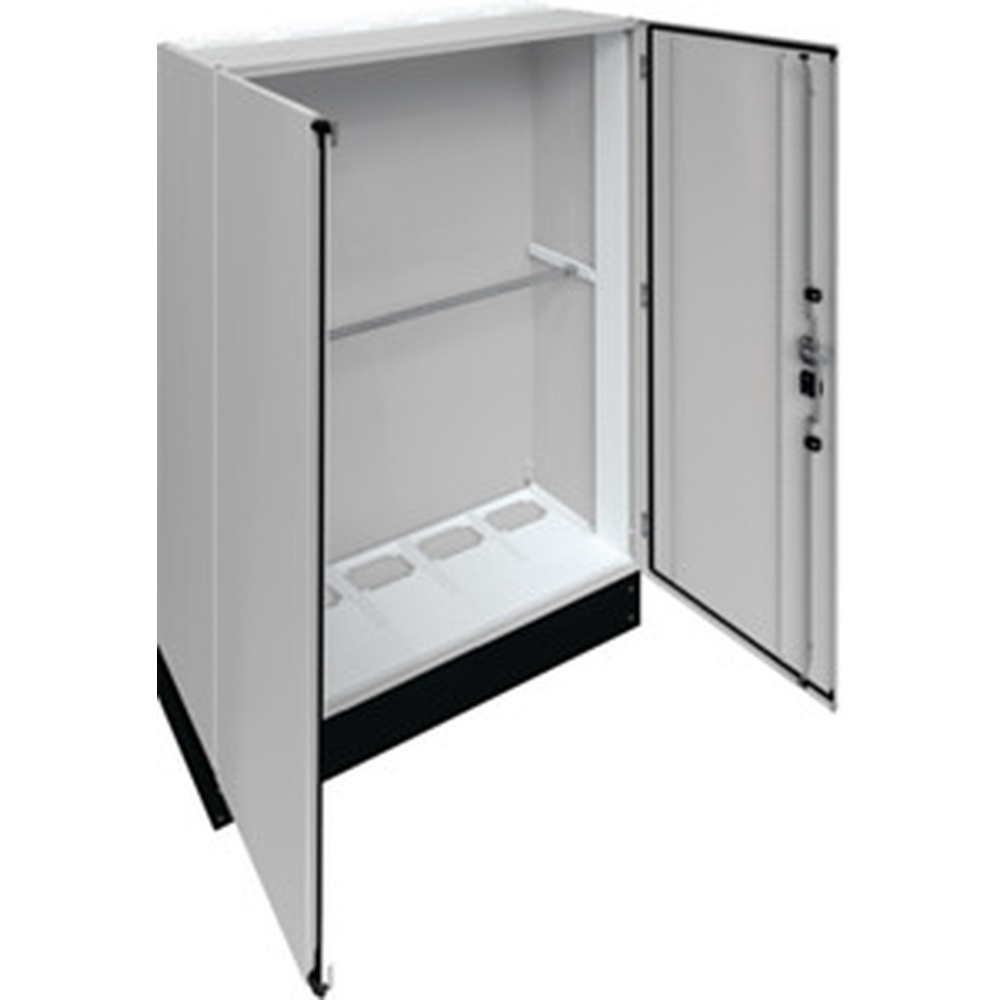 Hager Schrank FR25G2 Schr univers IP55 SKI 2050x1300x400mm Schrank univers IP55/I 1850x1300x400mm 200mm Sockel. Einzelstandverteiler für die Innenraummontage mit VDE-Gutachten Fertigungsüberwachung nach DIN EN 61439-1/-2/-3 und Maßnorm DIN 43 870 zur Aufputz Montage. Zum Aufbau einer Niederspannungsverteilung bis 800 A 3AC 230/400 V 50 Hz. Schutzart IP55 Schutzklasse I oder II Luft- und Kriechstrecken nach DIN VDE 0110-1/-2. Bestehend aus Schrank mit Tür aus pulverbeschichtetem eingebranntem profiliertem 1 5 mm dicken Stahlblech. Durchsteckflansche oben unten offen Leitungseinfügungen einbaubar . Sammelschienendurchführungen als seitliche Vorprägung. Tür aufliegend mit innen liegenden Scharnieren Türanschlag standardmäßig rechts wechselbar mit 110 Grad Öffnungswinkel. Serienmässig mit Schwenkhebelverschluss DIN-Profil-Halbzylinder einbaubar. Waagerechte Abfangschiene zur stabilisierung im Schrank enthalten. Türdichtung umlaufend geschäumt temperaturbeständig und ölbeständig. Sockelleiste Höhe 200 mm serienmäßig montiert mit abnehmbarer Frontblende. Hinweis Wand- und Bodenbefestigung notwendig! Türverschluß durch andere Schließungen austauschbar. Schrank nebeneinander anflanschbar. Hersteller Hager Nr. FR25G2 EAN Nr. 3250610701300 Warengruppe Hager Univers Schränke