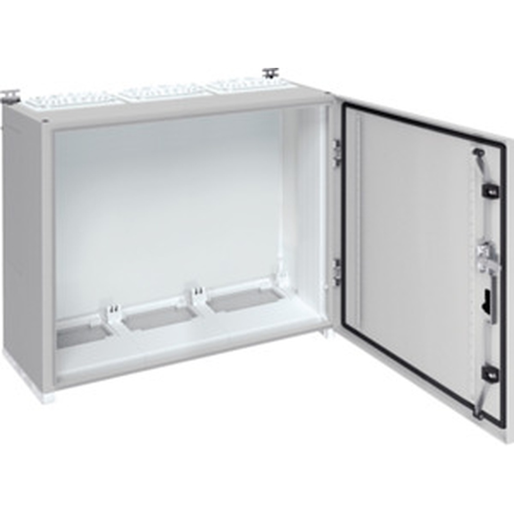 Hager Schrank FR53S Schr univers IP55 SKII 800x800x275mm Schrank univers IP55/II 800x800x275mm. Wandaufbauschrank für die Innenraummontage mit VDE-Gutachten Fertigungsüberwachung nach DIN EN 61439-1/-2/-3 und Maßnorm DIN 43870 zur Aufputz Montage. Zum Aufbau einer Niederspannungsverteilung bis 800 A 3AC 690 V 50 Hz. Schutzart IP55 Schutzklasse II Luft- und Kriechstrecken nach DIN VDE 0110-1/-2. Bestehend aus Schrank mit Tür aus pulverbeschichtetem eingebranntem profiliertem 1 5 mm dicken Stahlblech. Durchsteckflansche oben unten ISO-Flanschplatten mit metrischen Vorprägungen und Schnellverriegelung je Feld eingebaut. Sammelschienendurchführungen als seitliche Vorprägung. Tür aufliegend mit innenliegenden Scharnieren Türanschlag standardmäßig rechts wechselbar 110 Grad Öffnungswinkel. Serienmässig mit Schwenkhebelverschluss DIN-Profil-Halbzylinder einbaubar. Türdichtung umlaufend geschäumt temperaturbeständig und ölbeständig. Schrank nebeneinander und übereinander anflanschbar. Hersteller Hager Nr. FR53S EAN Nr. 3250610702567 Warengruppe Hager Univers Schränke