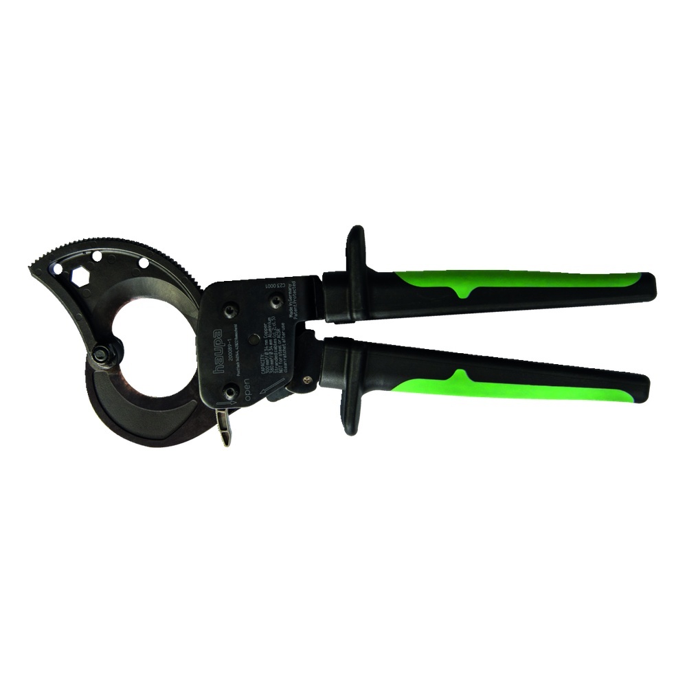 Haupa Handkabelschneider 200089-1 Handkabelschneider Ø 34 mm Zum Schneiden von Kupfer- und Aluminiumkabel nach DIN EN 60228 Mit Ratschenübersetzung Ideale Kraftumsetzung Einhandbetätigung durch optimale Hebelübersetzung und schrittweises Schneiden bis Ø 34 mm Entriegelungsmöglichkeit in jeder Schneidposition Material: Alle Teile aus hochfestem Spezialstahl, Schneiden und beanspruchte Teile vergütet oder gehärtet Oberflächen brüniert Ergonomisch geformte Soft-Handgriffe Farbe: schwarz/grün Schneidbereich: Kabel und isolierte Leitungen nach DIN EN 60228 Mehrdrähtige Kabel (Kl. 2, Kl. 5) Kupfer bis 300 mm² (sektorförmig, feindrähtig, Kommunikation/Daten) Mehrdrähtige Kabel (Kl. 2, Kl. 5) Aluminium bis 380 mm² (sektorförmig, feindrähtig, Kommunikation/Daten) Nicht für Stahl- oder ACSR-Kabel geeignet Ratsche nach Gebrauch reinigen Maße: Länge: ca. 260 mm Breite: ca. 100 mm Tiefe: ca. 36 mm Gewicht: ca. 600 g Hersteller Haupa Nr. 200089-1 EAN Nr. 4011923627027 Warengruppe Haupa Zubehör