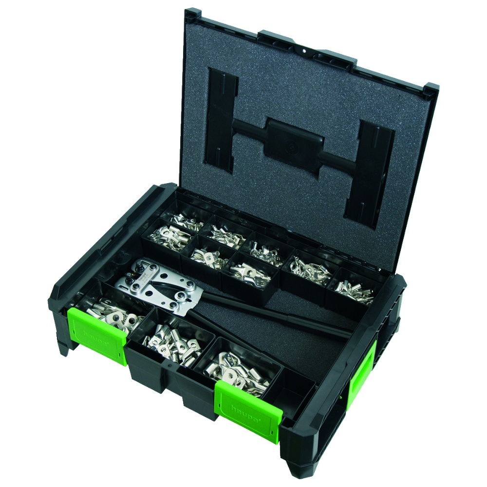 Haupa Presskabelschuhe 220385 SysCon Presskabelschuhe & 210805 K Inhalt: 380 Presskabelschuhe DIN 46235 verzinnt SysCon Presskabelschuhe DIN & 210805 K \1\220370\ABS Kunststoffbox „SysCon S“ \2\220376\Schaumeinlage „SysCon“ 400x300x15 mm \1\500270\Schaumstoffeinlage für Sortimente 160x400 mm \1\210805 K\Crimpzange Sechskantpressung DIN 6 – 50 mm2 \50\290404\Presskabelschuhe DIN\6\M6 \50\290406\Presskabelschuhe DIN\6\M8 \50\290410\Presskabelschuhe DIN\10\M6 \50\290412\Presskabelschuhe DIN\10\M8 \30\290418\Presskabelschuhe DIN\16\M8 \40\290420\Presskabelschuhe DIN\16\M10 \25\290426\Presskabelschuhe DIN\25\M8 \25\290428\Presskabelschuhe DIN\25\M10 \20\290434\Presskabelschuhe DIN\35\M8 \20\290436\Presskabelschuhe DIN\35\M10 \20\290440\Presskabelschuhe DIN\50\M8 EAN Nr. 4011923557522 Warengruppe Haupa Verbrauchsmaterial
