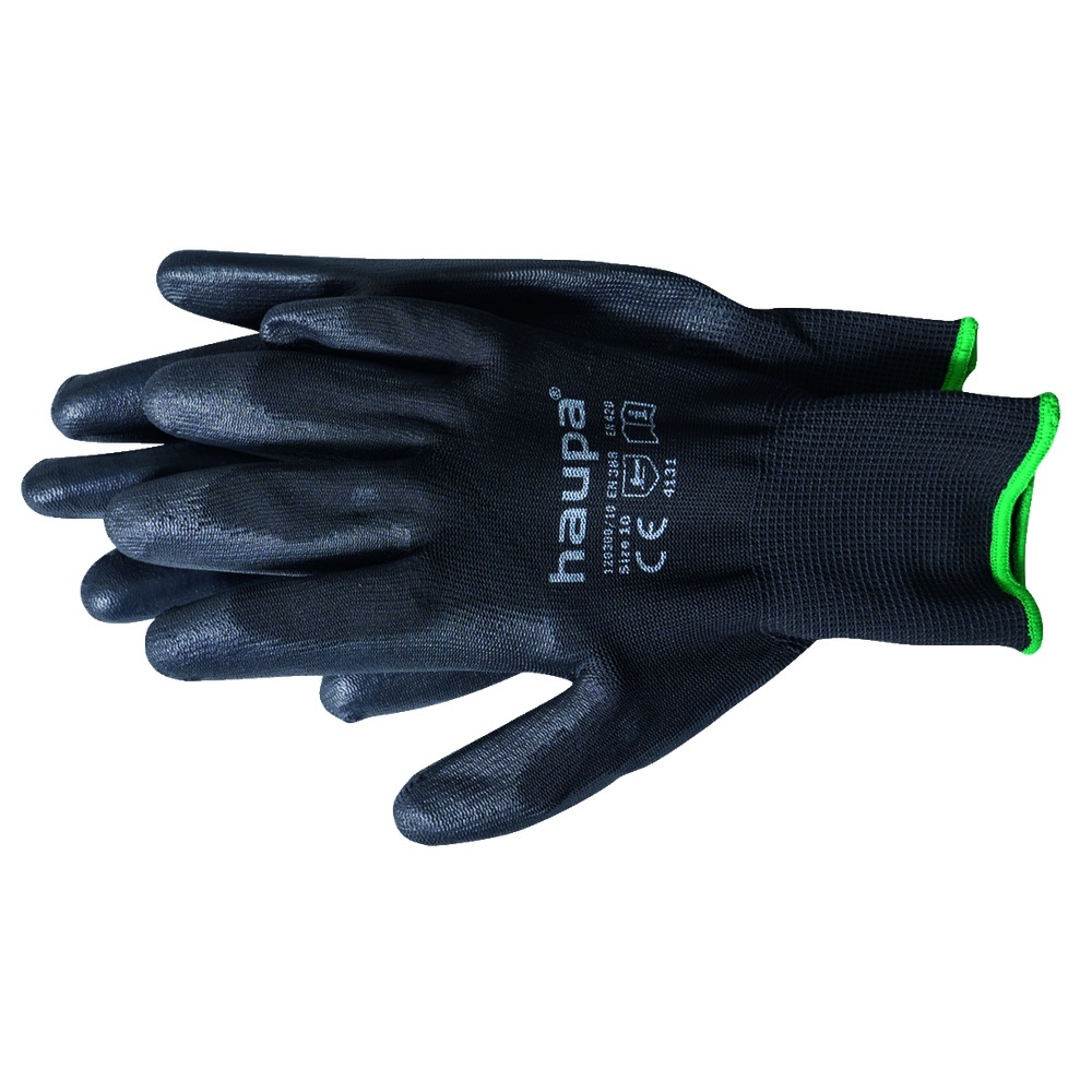 Haupa Textil Handschuh 120300/9 PU-Textil-Handschuh schwarz Gr. 9 PU-Textil-HandschuhPU-Arbeitshandschuh zum Schutz vor mechanischen Risiken gemäß EN420 Kat. 2, EN388 Level 4.1.3.1., schwarz/schwarz, Handinnenfläche und Fingerkuppen mit PU Beschichtung, Polyamid-Liner, Rundstrick-nahtlos, Strickbund, angenehmer Tragekomfort, atmungsaktiv, sicherer Griff mit exzellentem Tastgefühl, hohe Abriebfestigkeit für lange Standzeiten, hervorragende Passform, paarweise Hersteller Haupa Werkzeuge EAN Nr. 4011923602260 Warengruppe Haupa Zubehör