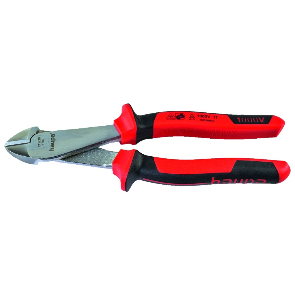Haupa VDE Kraftseitenschneider 211219 VDE Kraftseitenschneider 200 mm C 60, Schneiden induktiv gehärtet, für Piano Draht, verchromt, gesteckte Hüllen, hebelübersetzt. Kraftseitenschneider DIN 5238 A VDE EAN Nr. 4011923149949 Warengruppe Haupa Zangen
