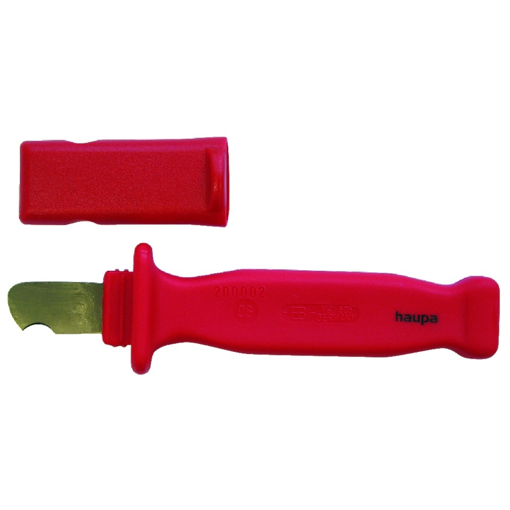 Haupa VDE Mantelschneider 200002 VDE Mantelschneider 35 mm mit hakenförmiger Schneide, Griff aus zähelastischem, schlagfestem Kunststoff, mit Klingenschutz, Daumenmulde vorne und Fingerhaken am Griffende. Anwendung: Rundkabel Kabelmesser VDE EAN Nr. 4011923064617 Warengruppe Haupa Schneiden u. Abisolieren