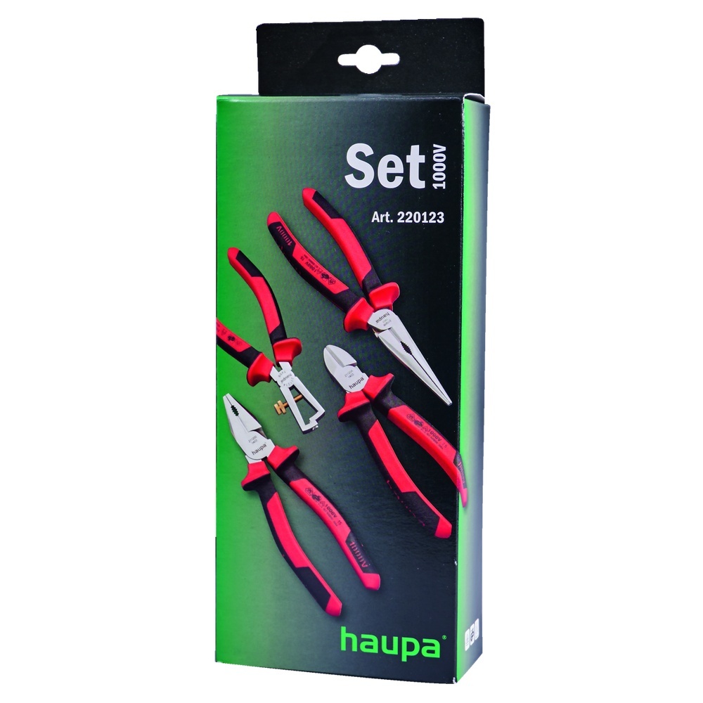 Haupa VDE Zangensatz 220123 VDE Zangensatz 4 tlg. mit VDE comfort grip Sicherheitsisolation, Zangen verchromt, 4 teilig # Zangensatz VDE, gesteckte Hüllen Inhalt: Kombinationszange 185 mm Seitenschneider 165 mm Storchschnabelzange 200 mm Abisolierzange 160 mm # EAN Nr. 4011923150037 Warengruppe Haupa Zangen