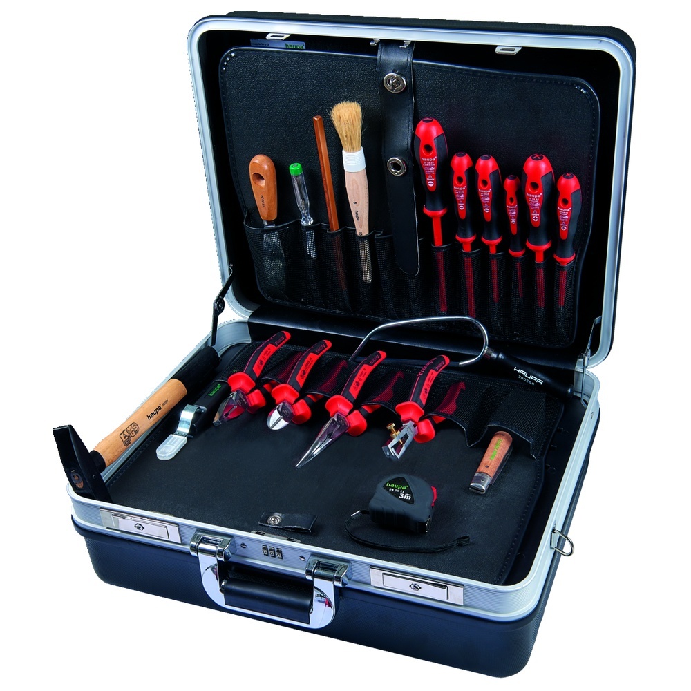 Haupa Werkzeugkoffer 220235 Werkzeugkoffer Start up VDE Hartschalenkoffer, schwarz, 2 Werkzeugtafeln, Zahlenschloss, Dokumententasche, Bodenschale mit variablen Trennstegen, Schultergurt, bestückt mit 19 Werkzeugen. Koffer 22 00 31. Werkzeugkoffer „Start up VDE“ Inhalt: 2K VDE Elektriker Schraubendreher 1000 V 2,5x75, 4x100, 5,5x125, 6,5x150 mm 2K VDE Kreuzschlitz Schraubendreher PH, Gr. 1 + 2 2K VDE Telefonzange 200 mm, 45 Grad abgewinkelt 2K VDE Kombinationszange 185 mm 2K VDE Seitenschneider 165 mm 2K VDE Abisolierzange 160 mm Abmantler mit Hakenklinge 8 28 mm Ø Kabelmesser, 1 teilig Schlosserhammer 300 g PUK Taschensäge mit festem Griff Elektriker Meißel 10x250 mm Spannungsprüfer Klinge 50 mm Maßband 3 m Malerspachtel 40 mm Wasserpinsel EAN Nr. 4011923450458 Warengruppe Haupa Koffer u. Sortimentskästen