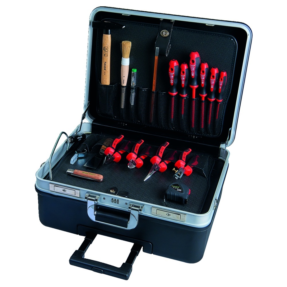 Haupa Werkzeugkoffer 220252 Werkzeugkoffer Start up mobil VDE Hartschalenkoffer, schwarz, Zahlenschloss, 1 Dokumentenfach, 2 abschließbare Schlösser, 2 Werkzeugtafeln, Bodenschale mit variablen Trennstegen, umlaufende Stoßleiste, hochwertige Beschläge. Koffer Art. 22 00 23. Werkzeug Trolly „Start up mobil“ 1000 V Inhalt: •2K VDE Elektriker Schraubendreher 2,5x75, 4x100, 5,5x125, 6,5x150 mm •2K VDE Kreuzschlitz Schraubendreher PH, Gr. 1 + 2 •2K Kombizange 180 mm •2K Seitenschneider 160 mm •2K Telefonzange 200 mm, 45 Grad abgewinkelt •2K Abisolierzange 160 mm •Abmantler mit Hakenklinge, Ø 8 – 28 mm •PUK Taschensäge mit festem Griff •Elektriker Meißel 10x250 mm •Spannungsprüfer Klinge 50 mm •Schlosserhammer 300 g •Maßband 3 m •Malerspachtel 40 mm •Kabelmesser, 1 teilig •Wasserpinsel EAN Nr. 4011923537173 Warengruppe Haupa Koffer u. Sortimentskästen