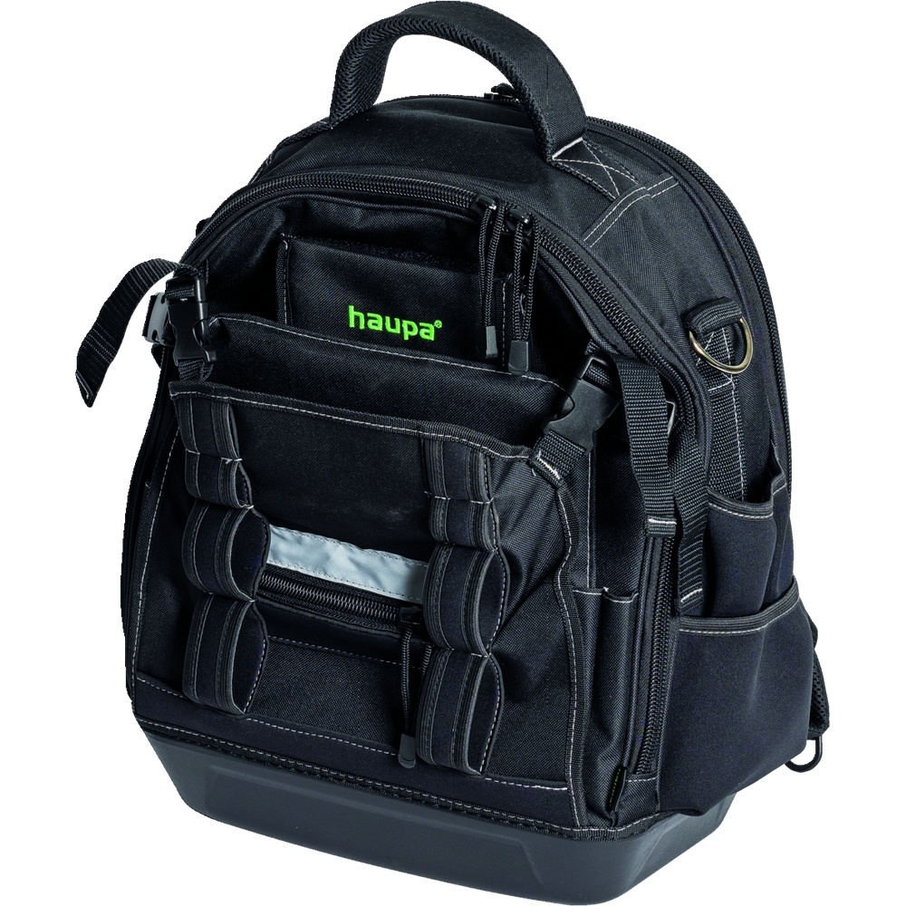 Haupa Werkzeugrucksack 220249 Werkzeugrucksack HUPtoGo Mobil unterwegs dank dem HAUPA Werkzeugrucksack HUPtoGo personalisierbar durch bestickbares Klettpad an Fronttasche 41 Fächer, davon 6 Außentaschen (3 Neopren) 4 Innentaschen mit Reissverschluss Fronteinstecklaschen Neopren (z.?B. Wasserwaage, lange Meißel) praktisches abnehmbares Kniepad wasserdichte hohe Bodenschale zum Schutz vor Nässe Reflexstreifen an der Front 2 Metall Befestigungsösen seitlich ergonomisch gepolsterte verstellbare Schultergurte gepolstertes Rückenteil und Tragegriff hohe Kippsicherheit, auch im geöffneten Zustand Material: extrem starkes 1680D-Polyester Farbe: schwarz mit grauen Nähten Hersteller Haupa Nr. 220249 EAN Nr. 4011923612511 Warengruppe Haupa Koffer u. Sortimentskästen