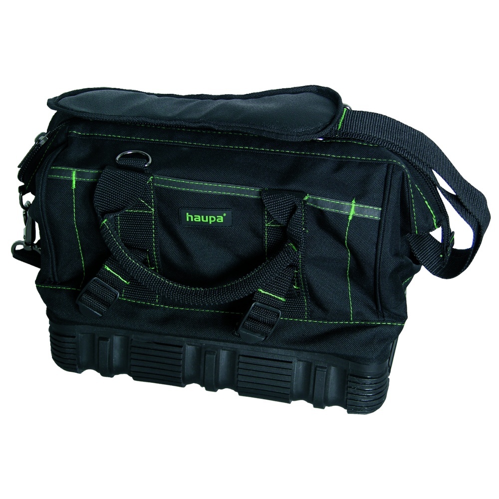 Haupa Werkzeugtasche 220061 Werkzeugtasche mit Gummibodenschale Werkzeugtasche mit Einsteckfächern innen und außen, Bodenschale mit Gummi verstärkt, doppelte Kreuznaht für hohe Belastung, abnehmbarer Schultergurt, verstellbar, 10 Einsteckfächer außen (verschiedene Größen), 10 Einsteckfächer innen (verschiedene Größen), Gurte für Wasserwaage (außen), Material: extra starkes 600D Polyester, wasserdicht und schmutzabweisend, Farbe: grün, schwarz Werkzeugkoffer „Tool bag“ EAN Nr. 4011923169794 Warengruppe Haupa Koffer u. Sortimentskästen
