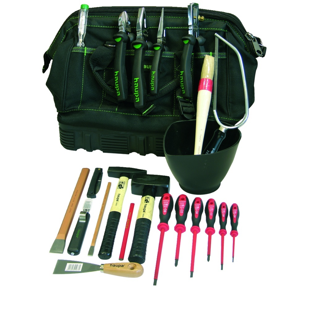 Haupa Werkzeugtasche 220500 Werkzeugtasche Tool Bag Werkzeugtasche für den Auszubildenden, mit Einsteckfächern innen und außen, Bodenschale mit Gummi verstärkt, doppelte Kreuznaht für hohe Belastung, abnehmbarer Schultergurt, verstellbar, 10 Einsteckfächer außen (verschiedene Größen), 10 Einsteckfächer innen (verschiedene Größen), Gurte für Wasserwaage (außen), Material: extra starkes 600D Polyester, wasserdicht und schmutzabweisend, Farbe: grün, schwarz, bestückt mit 22 Werkzeugen. Werkzeugkoffer „Tool bag“ Inhalt: 2K Kombinationszange 200 mm 2K Seitenschneider 160 mm 2K Storchschnabelzange gerade 2K Abisolierzange 160 mm 2K VDE Schraubendrehersatz, 6 Elektrikerschraubendreher Spannungsprüfer Abmantler Hakenklinge 8 28 Ø Wasserpinsel Malerspachtel 40 mm Elektrikermeißel 10x250 mm Steinmeißel 300 mm Schlosserhammer 300 g Fäustel 1000 g Gipsmulde Kabelmesser, 1 teilig PUK Säge mit festem Griff Zimmermannsbleistift EAN Nr. 4011923170011 Warengruppe Haupa Koffer u. Sortimentskästen