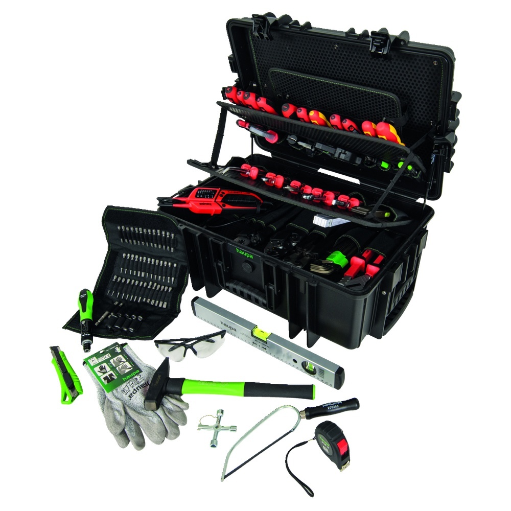 Haupa Werkzeugtrolley 220822 Werkzeugtrolley HUPtransporter StandardPlus Geräumig und übersichtlich – der HAUPA Werkzeugtrolley HUPtransporter StandardPlus bietet viel Raum für Werkzeug extrem stabiler Koffer: Gehäuse aus Polypropylen (PP), mit Gasdruckfeder, flugtauglich: automatisches Luftdruckausgleichsventil, stapelbar, staubdicht, vor Spritzwasser geschützt, Temperaturstabil von -30 °C bis +80 °C, ergonomischer Zwei-Komponentengriff, Ösen für Vorhängeschloss, Alu-Trennsteg-System, Farbe: schwarz, mit Eigentumskennzeichnung, Werkzeugtrolley HUPtransporter 220820 Inhalt: Abisolierzange Basic 0,5 – 6 mm² Uni-Abisolierer 0,2 – 4 mm² Crimpzange 0,75 – 16 mm Crimpzange Aderendhülsen 0,5 – 16 mm Crimpzange isolierte Kabelschuhe 0,5 – 6 mm² VDE-Allround-Soft-Gripschere 160 mm, 70 mm² VDE-Storchschnabelzange gebogen 200 mm* VDE-Kabelschneider 160 mm VDE-Seitenschneider 160 mm* VDE-Kraftseitenschneider 200 mm VDE-Zangenschlüssel 280 mm VDE-Kabelmesser gerade Klinge Schaltschrankschlüssel Cuttermesser HUPblackSeries18 Cutterklingen HUPblades18 Abmantler mit Hakenklinge 8 – 28 mm² Basic Entmantler 4 – 13 mm Tiefloch-Marker, 2 in 1, schwarz, mit Spitzer Elektronik-ESD-Seitenschneider ohne Wate 115 mm Sechskant-Winkelschraubendreher-Set mit Kugelkopf, 9-tlg. 1,5 – 10 mm, extra lang VDE-Schraubendreher HUPslim* PZ/FL 1 + 2 PZ 1 + 2 PH 1 + 2 VDE-Elektriker-Schraubendreher HUPslim* 3,5x0,6x100, 4x0,8x100 mm, 4x1x100 mm, 5,5x1x125 mm, 6,5x1,2x150 mm Elektrikermeißel 10x250 mm Steinmeißel flachoval 32x300 mm Schaltschrank-Wasserwaage 200 mm Leichtmetallwasserwaage 400 mm Maßband 5 m Maßstab 1 m LED Taschenlampe Pen Torch Schlosserhammer 500 g Puk-Säge mit festem Griff Spannungsprüfer Profi LED Plus 12 – 1.000 V Knarrenschraubendreher-Set FlexBag PU-Schnittschutzhandschuh Level 3, grau, Gr. 10 * Perfektionierte Schneidkraft-Performance Hersteller Haupa Nr. 220822 EAN Nr. 4011923630164 Warengruppe Haupa Koffer u. Sortimentskästen