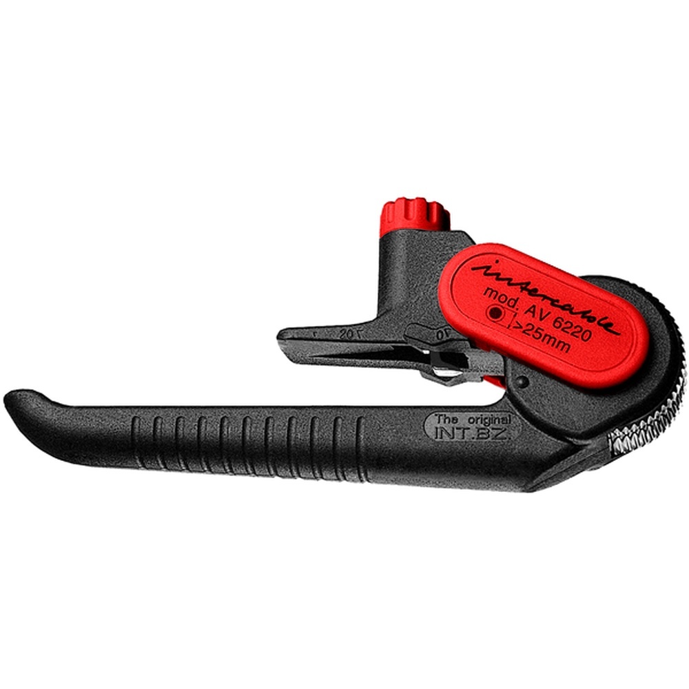 Intercable Aussenmantelschneider 100820 Typ AV6220 zum Entfernen sämtlicher Isolationsschichten von Kabeln mit Durchmesser ab 25mm, Schnitttiefe einstellbar von 0-5 mm, auswechselbares Doppelmesser bzw. Wendeklinge, geeignet für Längsschnitt und Kreisschnitt, Lieferung im handlichen Etui. Hersteller Intercable Tools Nr. 100820 Typ AV6220 EAN Nr. 8014212008152