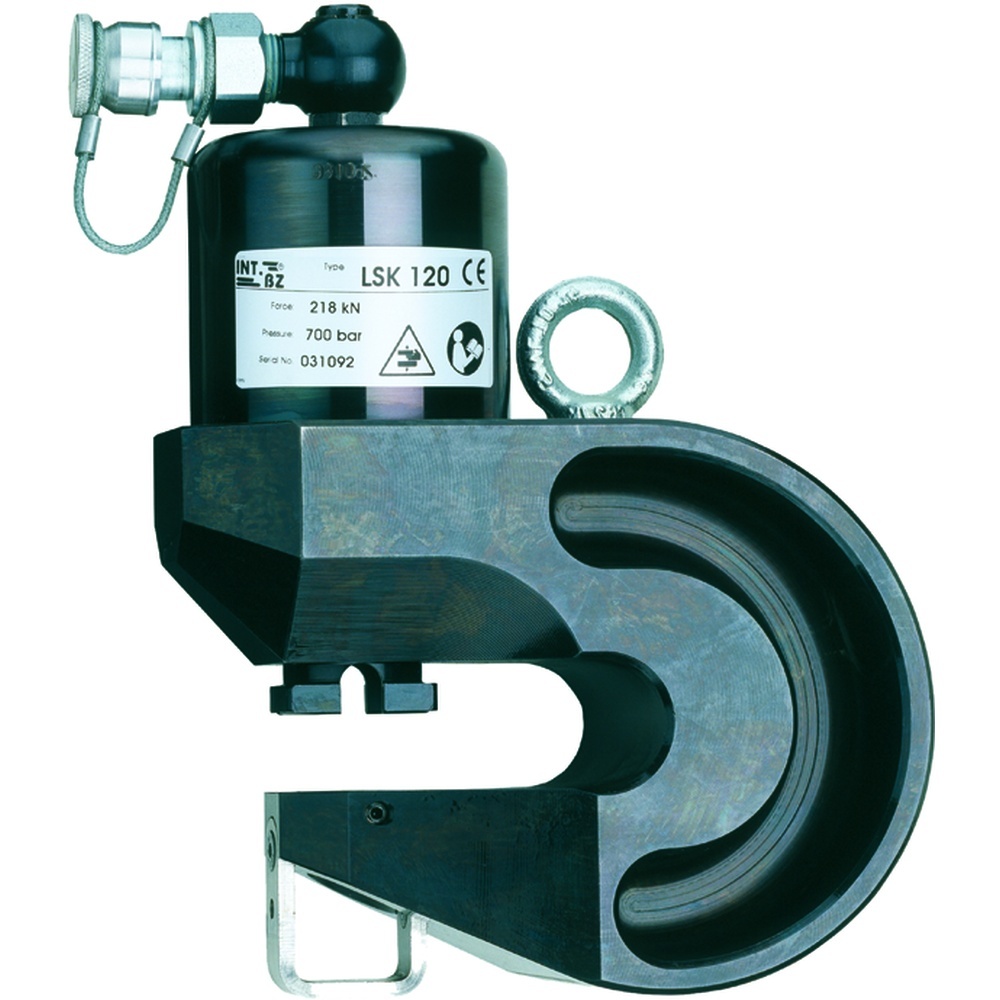 Intercable Hydraulischer 712218 Typ LSK120 zum Stanzen von Schienen bis 120 x 12mm aus Kupfer, Aluminium, oder Stahl mit einer Zugfestigkeit bis 470N/qmm, robuste und kompakte Bauweise, C-förmiger Kopf zum leichten Einführen der zu bearbeitenden Schiene, schnelles und einfaches Einsetzen der Lochstempel und Matrizen, Einsatz auch bei montierten Schienensystemen ohne Demontage möglich, Schnellkupplungssystem, mittige Lochung bis zu einer Schienenbreite von 120mm möglich, Stanzkraft max. 218kN, Betriebsdruck 700bar Hersteller Intercable Tools Nr. 712218 Typ LSK120 EAN Nr. 8014212111470