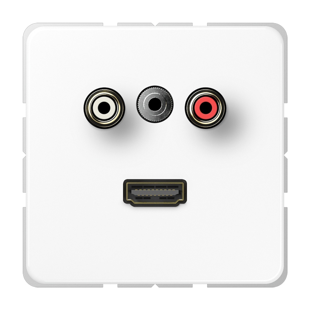 Jung Cinch Audio Miniklinke MA CD 1082 WW Cinch Audio, Miniklinke 3,5 mm und HDMI, für die Serie CD, mit Tragring, Schraubbefestigung, bruchsicher, Technische Daten Cinch Audio Nennspannung DC 50 V, Frequenzbereich 20 Hz bis 20 KHz, Kontaktwiderstand 20 m, Isolationswiderstand 100 M, Spannungsfestigkeit AC 500 V ~ 50/60 Hz bei 1 min 2 mA, Steck- und Abziehkräfte 3 bis 25 N, Steckzyklen 1000, Durchgangsbuchse weiß links, rot rechts, Kontaktmaterial vergoldet, Umgebungstemperatur – 5 bis + 45 GradC, Technische Daten Miniklinke 3,5 mm Nennspannung DC 50 V, Frequenzbereich 20 Hz bis 20 KHz, Kontaktwiderstand 20 m, Isolationswiderstand 100 M, Spannungsfestigkeit AC 500 bis 2000 V ~, DC 800 V, Steck- und Abziehkräfte 4,9 bis 14,7 N, Steckzyklen 2000, Durchgangsbuchse 3,5 mm, Audio Stereo, 180 Grad, Kontaktmaterial vergoldet, Umgebungstemperatur – 5 bis + 45 GradC, Technische Daten HDMI Standard 1.3, Category 2, Unterstützung der HDMI™-Technologie V 1.3 mit Deep Color, Video Bandbreite 1,65 GHz, Auflösung 1080 p 1280x1024 Pixel, Frequenzbereich vertikal 50 bis 85 Hz, Übertragungsrate 10,2 GBit/s, Durchgangsbuchse HDMI™, Typ A, 180 Grad, Kontaktmaterial vergoldet, Umgebungstemperatur – 5 bis + 45 GradC Hersteller Albrecht Jung GmbH & Co. KG Typ MACD1082WW EAN Nr. 4011377132429 Warengruppe Jung Technik