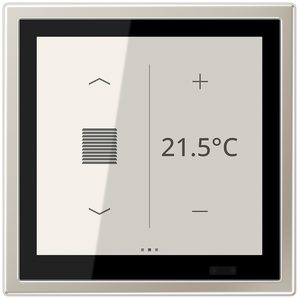 Jung KNX Raumcontroller ES459D1S KNX Raumcontroller LS TOUCH mit Rahmen LS 990, Serie LS, Edelstahl mit integriertem 1fach-Rahmen LS 990 Nur als Einzelgerät zu montieren! Bestimmungsgemäßer Gebrauch Bedienen von Verbrauchern und Visualisieren von Anlagenzuständen und Informationen, z.B. Licht schalten und dimmen, Behänge steuern, Temperatur- und Verbrauchswerte etc. Messen und Regeln der Raumtemperatur Montage in Gerätedose mit Abmessungen nach DIN 49073 Produkteigenschaften Hochauflösendes IPS Farbdisplay Kapazitiver Touchscreen Funktionen der Favoriten-Seiten einstellbar (ohne ETS) Max. 32 Bedienfunktionen Schalten, Dimmen, Jalousiesteuerung, Wertgeber, Szenenaufruf etc. Integrierter Raumtemperaturfühler Raumtemperaturregelung mit Sollwertvorgabe Alarmfunktion (akustisch und/oder optisch) Max. 8 Zeitschaltfunktionen aktivierbar und einstellbar (abhängig von Uhrzeit, Astro oder Zufall) Integrierter Näherungs- und Helligkeitssensor Integrierter Busankoppler Anschluss von Installationstastern oder Reedkontakten möglich Inbetriebnahme und Unterstützung von KNX Data Secure mit ETS ab Version 5.7.4 Anzeige von Raum- und Soll-Temperatur Fernfühler (Art.-Nr.: FF NTC) anschließbar Anzeige der Außentemperatur – mit externem Sensor, z.B. Wetterstation In Verbindung mit JUNG Smart Visu Server: Steuerung von Musikwiedergabe und Lautstärkeregelung Hersteller Jung EAN Nr. 4011377194915 Warengruppe Jung Serie LS