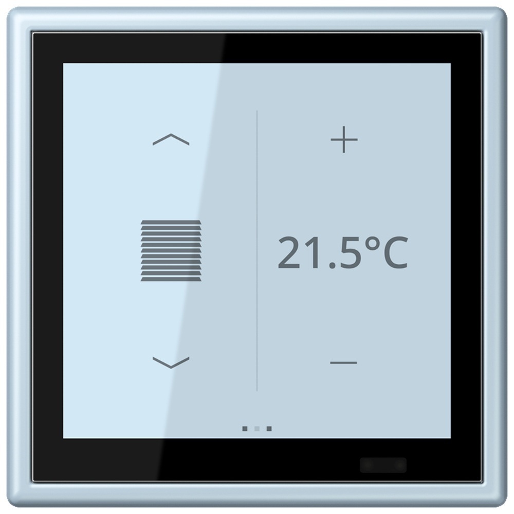 Jung KNX Raumcontroller LC459D1S208 KNX Raumcontroller LS TOUCH mit Rahmen LS 990, Serie LS, outremer clair (32022) mit integriertem 1fach-Rahmen LS 990 Nur als Einzelgerät zu montieren! Bestimmungsgemäßer Gebrauch Bedienen von Verbrauchern und Visualisieren von Anlagenzuständen und Informationen, z.B. Licht schalten und dimmen, Behänge steuern, Temperatur- und Verbrauchswerte etc. Messen und Regeln der Raumtemperatur Montage in Gerätedose mit Abmessungen nach DIN 49073 Produkteigenschaften Hochauflösendes IPS Farbdisplay Kapazitiver Touchscreen Funktionen der Favoriten-Seiten einstellbar (ohne ETS) Max. 32 Bedienfunktionen Schalten, Dimmen, Jalousiesteuerung, Wertgeber, Szenenaufruf etc. Integrierter Raumtemperaturfühler Raumtemperaturregelung mit Sollwertvorgabe Alarmfunktion (akustisch und/oder optisch) Max. 8 Zeitschaltfunktionen aktivierbar und einstellbar (abhängig von Uhrzeit, Astro oder Zufall) Integrierter Näherungs- und Helligkeitssensor Integrierter Busankoppler Anschluss von Installationstastern oder Reedkontakten möglich Inbetriebnahme und Unterstützung von KNX Data Secure mit ETS ab Version 5.7.4 Anzeige von Raum- und Soll-Temperatur Fernfühler (Art.-Nr.: FF NTC) anschließbar Anzeige der Außentemperatur – mit externem Sensor, z.B. Wetterstation In Verbindung mit JUNG Smart Visu Server: Steuerung von Musikwiedergabe und Lautstärkeregelung Hersteller Jung EAN Nr. 4011377296244 Warengruppe Jung Les Couleurs Le Corbusier