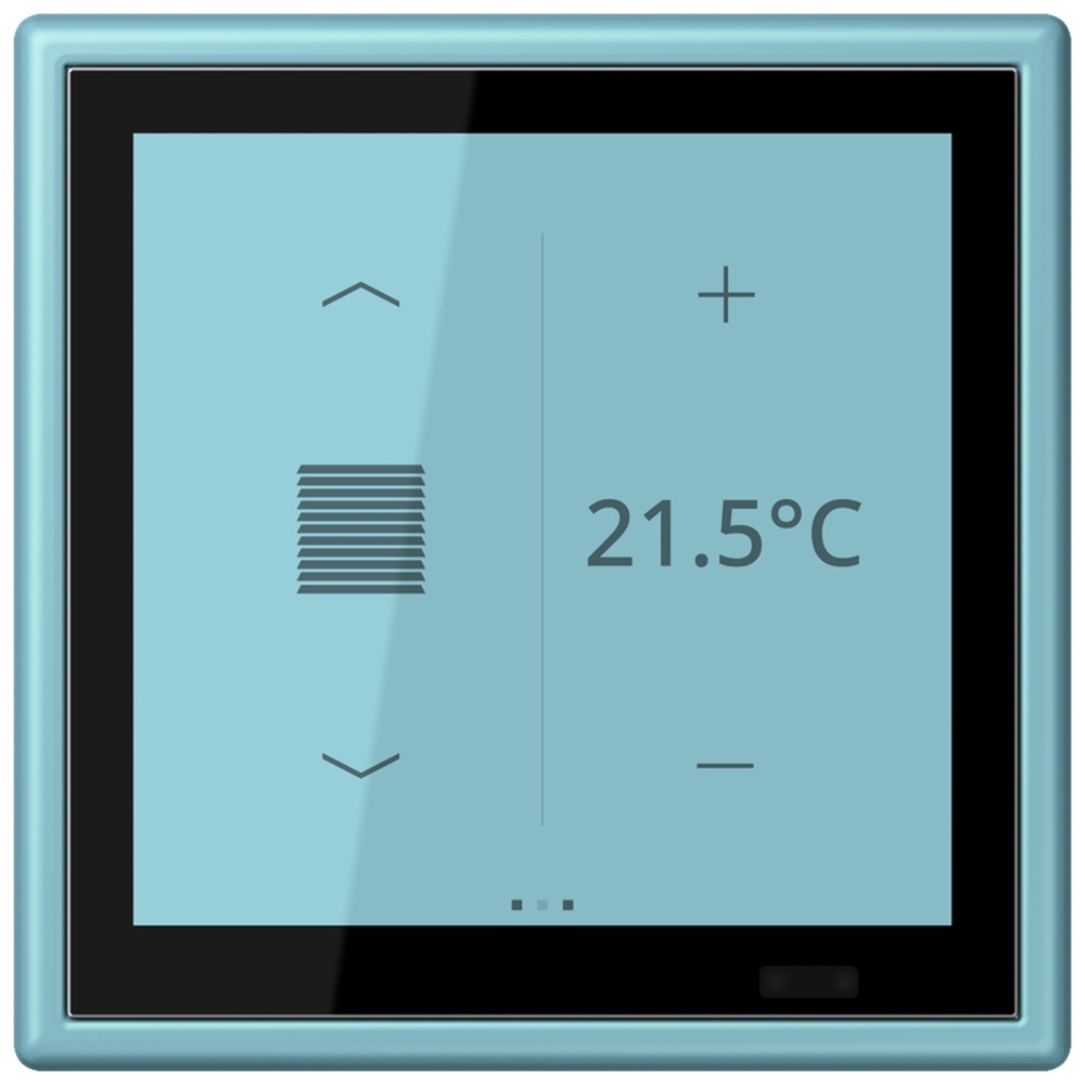 Jung KNX Raumcontroller LC459D1S213 KNX Raumcontroller LS TOUCH mit Rahmen LS 990, Serie LS, céruléen moyen (32032) mit integriertem 1fach-Rahmen LS 990 Nur als Einzelgerät zu montieren! Bestimmungsgemäßer Gebrauch Bedienen von Verbrauchern und Visualisieren von Anlagenzuständen und Informationen, z.B. Licht schalten und dimmen, Behänge steuern, Temperatur- und Verbrauchswerte etc. Messen und Regeln der Raumtemperatur Montage in Gerätedose mit Abmessungen nach DIN 49073 Produkteigenschaften Hochauflösendes IPS Farbdisplay Kapazitiver Touchscreen Funktionen der Favoriten-Seiten einstellbar (ohne ETS) Max. 32 Bedienfunktionen Schalten, Dimmen, Jalousiesteuerung, Wertgeber, Szenenaufruf etc. Integrierter Raumtemperaturfühler Raumtemperaturregelung mit Sollwertvorgabe Alarmfunktion (akustisch und/oder optisch) Max. 8 Zeitschaltfunktionen aktivierbar und einstellbar (abhängig von Uhrzeit, Astro oder Zufall) Integrierter Näherungs- und Helligkeitssensor Integrierter Busankoppler Anschluss von Installationstastern oder Reedkontakten möglich Inbetriebnahme und Unterstützung von KNX Data Secure mit ETS ab Version 5.7.4 Anzeige von Raum- und Soll-Temperatur Fernfühler (Art.-Nr.: FF NTC) anschließbar Anzeige der Außentemperatur – mit externem Sensor, z.B. Wetterstation In Verbindung mit JUNG Smart Visu Server: Steuerung von Musikwiedergabe und Lautstärkeregelung Hersteller Jung EAN Nr. 4011377210134 Warengruppe Jung Les Couleurs Le Corbusier