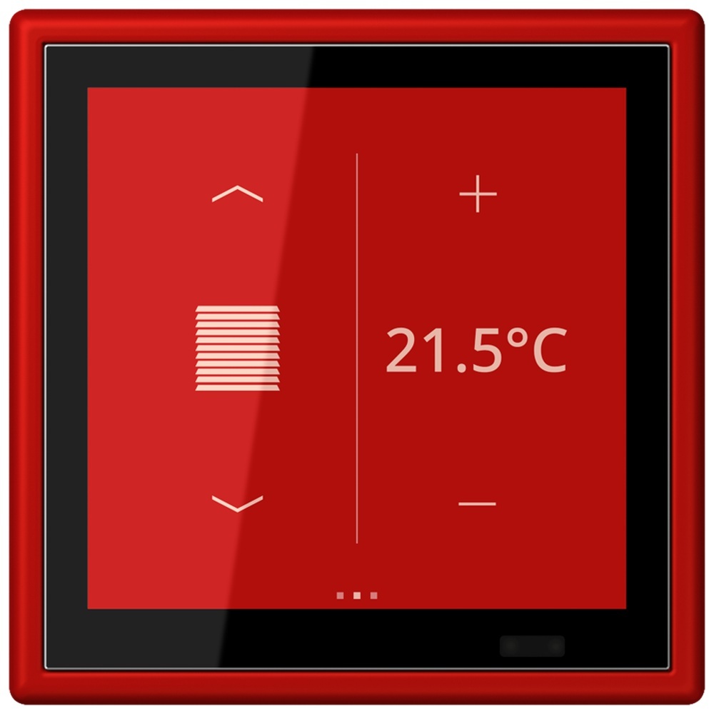 Jung KNX Raumcontroller LC459D1S227 KNX Raumcontroller LS TOUCH mit Rahmen LS 990, Serie LS, rouge vermillon 31 (32090) mit integriertem 1fach-Rahmen LS 990 Nur als Einzelgerät zu montieren! Bestimmungsgemäßer Gebrauch Bedienen von Verbrauchern und Visualisieren von Anlagenzuständen und Informationen, z.B. Licht schalten und dimmen, Behänge steuern, Temperatur- und Verbrauchswerte etc. Messen und Regeln der Raumtemperatur Montage in Gerätedose mit Abmessungen nach DIN 49073 Produkteigenschaften Hochauflösendes IPS Farbdisplay Kapazitiver Touchscreen Funktionen der Favoriten-Seiten einstellbar (ohne ETS) Max. 32 Bedienfunktionen Schalten, Dimmen, Jalousiesteuerung, Wertgeber, Szenenaufruf etc. Integrierter Raumtemperaturfühler Raumtemperaturregelung mit Sollwertvorgabe Alarmfunktion (akustisch und/oder optisch) Max. 8 Zeitschaltfunktionen aktivierbar und einstellbar (abhängig von Uhrzeit, Astro oder Zufall) Integrierter Näherungs- und Helligkeitssensor Integrierter Busankoppler Anschluss von Installationstastern oder Reedkontakten möglich Inbetriebnahme und Unterstützung von KNX Data Secure mit ETS ab Version 5.7.4 Anzeige von Raum- und Soll-Temperatur Fernfühler (Art.-Nr.: FF NTC) anschließbar Anzeige der Außentemperatur – mit externem Sensor, z.B. Wetterstation In Verbindung mit JUNG Smart Visu Server: Steuerung von Musikwiedergabe und Lautstärkeregelung Hersteller Jung EAN Nr. 4011377296442 Warengruppe Jung Les Couleurs Le Corbusier