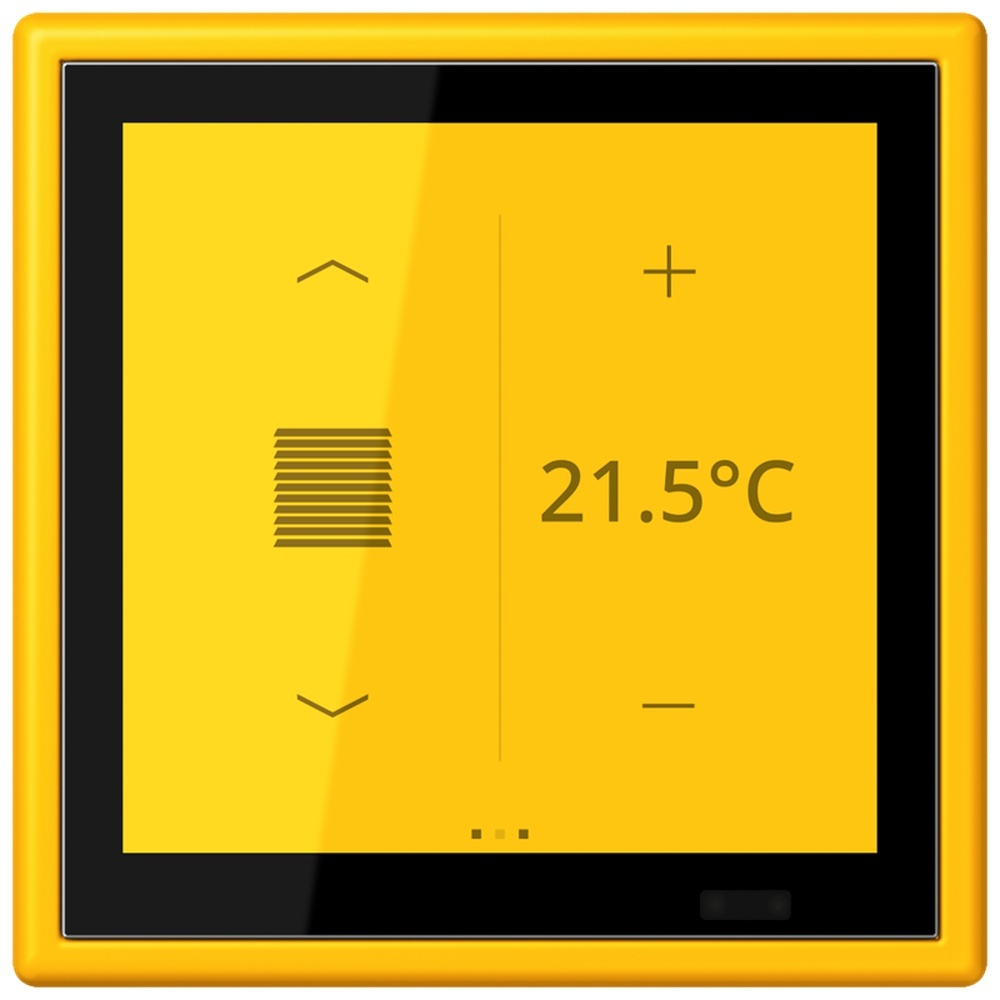 Jung KNX Raumcontroller LC459D1S263 KNX Raumcontroller LS TOUCH mit Rahmen LS 990, Serie LS, le jaune vif (4320W) mit integriertem 1fach-Rahmen LS 990 Nur als Einzelgerät zu montieren! Bestimmungsgemäßer Gebrauch Bedienen von Verbrauchern und Visualisieren von Anlagenzuständen und Informationen, z.B. Licht schalten und dimmen, Behänge steuern, Temperatur- und Verbrauchswerte etc. Messen und Regeln der Raumtemperatur Montage in Gerätedose mit Abmessungen nach DIN 49073 Produkteigenschaften Hochauflösendes IPS Farbdisplay Kapazitiver Touchscreen Funktionen der Favoriten-Seiten einstellbar (ohne ETS) Max. 32 Bedienfunktionen Schalten, Dimmen, Jalousiesteuerung, Wertgeber, Szenenaufruf etc. Integrierter Raumtemperaturfühler Raumtemperaturregelung mit Sollwertvorgabe Alarmfunktion (akustisch und/oder optisch) Max. 8 Zeitschaltfunktionen aktivierbar und einstellbar (abhängig von Uhrzeit, Astro oder Zufall) Integrierter Näherungs- und Helligkeitssensor Integrierter Busankoppler Anschluss von Installationstastern oder Reedkontakten möglich Inbetriebnahme und Unterstützung von KNX Data Secure mit ETS ab Version 5.7.4 Anzeige von Raum- und Soll-Temperatur Fernfühler (Art.-Nr.: FF NTC) anschließbar Anzeige der Außentemperatur – mit externem Sensor, z.B. Wetterstation In Verbindung mit JUNG Smart Visu Server: Steuerung von Musikwiedergabe und Lautstärkeregelung Hersteller Jung EAN Nr. 4011377210721 Warengruppe Jung Les Couleurs Le Corbusier