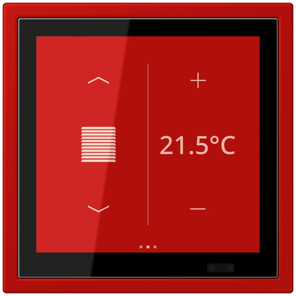 Jung KNX Raumcontroller LCZ459BFD1S227 KNX Raumcontroller LS TOUCH mit Rahmen LS ZERO, Serie LS, rouge vermillon 31 (32090) mit integriertem 1fach-Rahmen LS ZERO inklusive Saugheber (Art.-Nr.: W-HEBER) zur Demontage des Gerätes vom Tragring Nur als Einzelgerät zu montieren! Bestimmungsgemäßer Gebrauch Bedienen von Verbrauchern und Visualisieren von Anlagenzuständen und Informationen, z.B. Licht schalten und dimmen, Behänge steuern, Temperatur- und Verbrauchswerte etc. Messen und Regeln der Raumtemperatur Montage in Gerätedose mit Abmessungen nach DIN 49073 Produkteigenschaften Hochauflösendes IPS Farbdisplay Kapazitiver Touchscreen Funktionen der Favoriten-Seiten einstellbar (ohne ETS) Max. 32 Bedienfunktionen Schalten, Dimmen, Jalousiesteuerung, Wertgeber, Szenenaufruf etc. Integrierter Raumtemperaturfühler Raumtemperaturregelung mit Sollwertvorgabe Alarmfunktion (akustisch und/oder optisch) Max. 8 Zeitschaltfunktionen aktivierbar und einstellbar (abhängig von Uhrzeit, Astro oder Zufall) Integrierter Näherungs- und Helligkeitssensor Integrierter Busankoppler Anschluss von Installationstastern oder Reedkontakten möglich Inbetriebnahme und Unterstützung von KNX Data Secure mit ETS ab Version 5.7.4 Anzeige von Raum- und Soll-Temperatur Fernfühler (Art.-Nr.: FF NTC) anschließbar Anzeige der Außentemperatur – mit externem Sensor, z.B. Wetterstation In Verbindung mit JUNG Smart Visu Server: Steuerung von Musikwiedergabe und Lautstärkeregelung Hersteller Jung EAN Nr. 4011377211025 Warengruppe Jung Les Couleurs Le Corbusier
