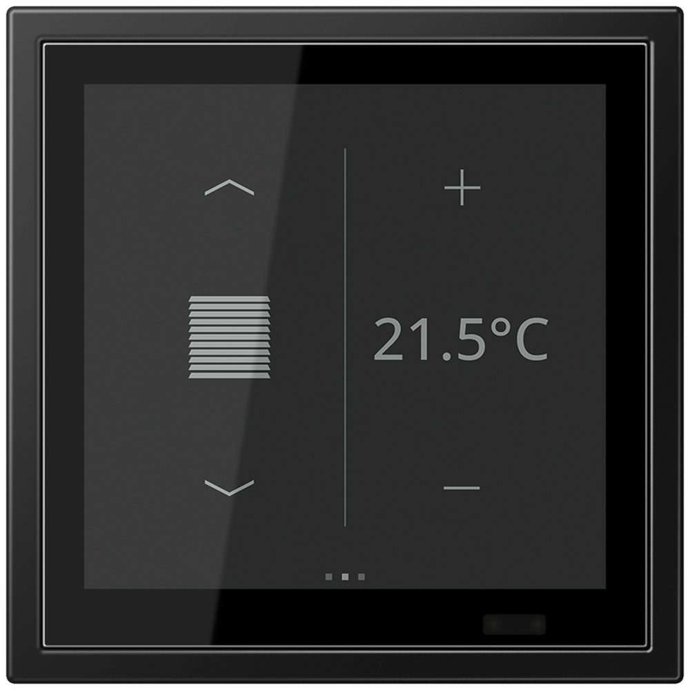 Jung KNX Raumcontroller LSZ459BFD1SSWM KNX Raumcontroller LS TOUCH mit Rahmen LS ZERO, Serie LS, graphitschwarz matt mit integriertem 1fach-Rahmen LS ZERO inklusive Saugheber (Art.-Nr.: W-HEBER) zur Demontage des Gerätes vom Tragring Nur als Einzelgerät zu montieren! mit integriertem 1fach-Rahmen LS ZERO Bestimmungsgemäßer Gebrauch Bedienen von Verbrauchern und Visualisieren von Anlagenzuständen und Informationen, z.B. Licht schalten und dimmen, Behänge steuern, Temperatur- und Verbrauchswerte etc. Messen und Regeln der Raumtemperatur Montage in Gerätedose mit Abmessungen nach DIN 49073 Produkteigenschaften Hochauflösendes IPS Farbdisplay Kapazitiver Touchscreen Funktionen der Favoriten-Seiten einstellbar (ohne ETS) Max. 32 Bedienfunktionen Schalten, Dimmen, Jalousiesteuerung, Wertgeber, Szenenaufruf etc. Integrierter Raumtemperaturfühler Raumtemperaturregelung mit Sollwertvorgabe Alarmfunktion (akustisch und/oder optisch) Max. 8 Zeitschaltfunktionen aktivierbar und einstellbar (abhängig von Uhrzeit, Astro oder Zufall) Integrierter Näherungs- und Helligkeitssensor Integrierter Busankoppler Anschluss von Installationstastern oder Reedkontakten möglich Inbetriebnahme und Unterstützung von KNX Data Secure mit ETS ab Version 5.7.4 Anzeige von Raum- und Soll-Temperatur Fernfühler (Art.-Nr.: FF NTC) anschließbar Anzeige der Außentemperatur – mit externem Sensor, z.B. Wetterstation In Verbindung mit JUNG Smart Visu Server: Steuerung von Musikwiedergabe und Lautstärkeregelung Hersteller Jung EAN Nr. 4011377206632 Warengruppe Jung Serie LS