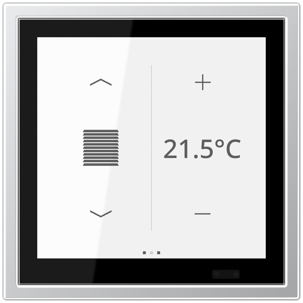 Jung KNX Raumcontroller LSZAL459BFD1S KNX Raumcontroller LS TOUCH mit Rahmen LS ZERO, Serie LS, Aluminium mit integriertem 1fach-Rahmen LS ZERO inklusive Saugheber (Art.-Nr.: W-HEBER) zur Demontage des Gerätes vom Tragring Nur als Einzelgerät zu montieren! Bestimmungsgemäßer Gebrauch Bedienen von Verbrauchern und Visualisieren von Anlagenzuständen und Informationen, z.B. Licht schalten und dimmen, Behänge steuern, Temperatur- und Verbrauchswerte etc. Messen und Regeln der Raumtemperatur Montage in Gerätedose mit Abmessungen nach DIN 49073 Produkteigenschaften Hochauflösendes IPS Farbdisplay Kapazitiver Touchscreen Funktionen der Favoriten-Seiten einstellbar (ohne ETS) Max. 32 Bedienfunktionen Schalten, Dimmen, Jalousiesteuerung, Wertgeber, Szenenaufruf etc. Integrierter Raumtemperaturfühler Raumtemperaturregelung mit Sollwertvorgabe Alarmfunktion (akustisch und/oder optisch) Max. 8 Zeitschaltfunktionen aktivierbar und einstellbar (abhängig von Uhrzeit, Astro oder Zufall) Integrierter Näherungs- und Helligkeitssensor Integrierter Busankoppler Anschluss von Installationstastern oder Reedkontakten möglich Inbetriebnahme und Unterstützung von KNX Data Secure mit ETS ab Version 5.7.4 Anzeige von Raum- und Soll-Temperatur Fernfühler (Art.-Nr.: FF NTC) anschließbar Anzeige der Außentemperatur – mit externem Sensor, z.B. Wetterstation In Verbindung mit JUNG Smart Visu Server: Steuerung von Musikwiedergabe und Lautstärkeregelung Hersteller Jung EAN Nr. 4011377206649 Warengruppe Jung Serie LS