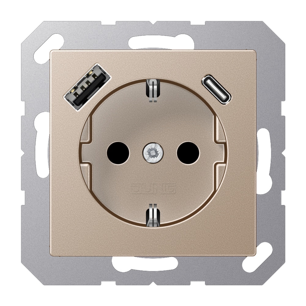 Jung SCHUKO Steckdose A1520-15CACH SCHUKO Steckdose mit 1 USB-Buchse Typ A und 1 USB-Buchse Typ C, Berührungsschutz, Serie A, champagner mit integriertem erhöhten Berührungsschutz mit 1 USB-Buchse Typ A und 1 USB-Buchse Typ C mit Federklemmen für starre Leiter bis 2,5 mm2 Verbindungsklemmen nach DIN VDE 0620 Montage in Gerätedose nach DIN 49073 Montagehinweis tiefe Dose (min. 60 mm) verwenden Material Thermoplast lackiert Hersteller Albrecht Jung GmbH & Co. KG EAN Nr. 4011377184367 Warengruppe Jung Serie A
