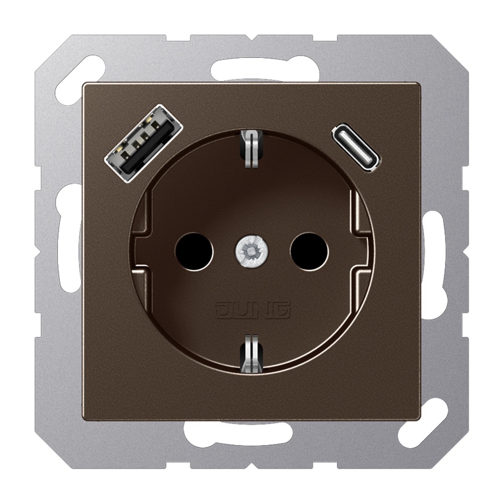 Jung SCHUKO Steckdose A1520-15CAMO SCHUKO Steckdose mit 1 USB-Buchse Typ A und 1 USB-Buchse Typ C, Berührungsschutz, Serie A, mokka mit integriertem erhöhten Berührungsschutz mit 1 USB-Buchse Typ A und 1 USB-Buchse Typ C mit Federklemmen für starre Leiter bis 2,5 mm2 Verbindungsklemmen nach DIN VDE 0620 Montage in Gerätedose nach DIN 49073 Montagehinweis tiefe Dose (min. 60 mm) verwenden Material Thermoplast lackiert Hersteller Albrecht Jung GmbH & Co. KG EAN Nr. 4011377184374 Warengruppe Jung Serie A