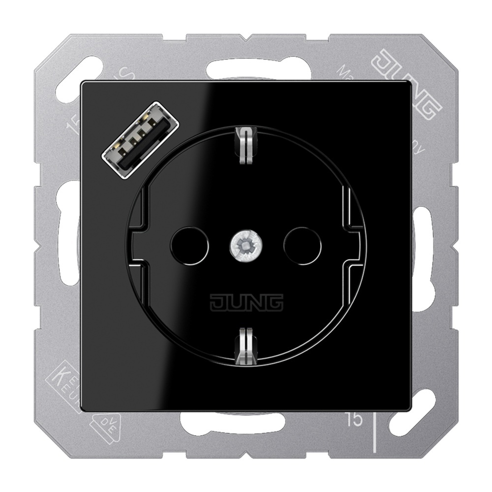 Jung SCHUKO Steckdose A1520-18ASW SCHUKO Steckdose mit 1 USB-Buchse Typ A, Berührungsschutz, Serie A, schwarz mit integriertem erhöhten Berührungsschutz mit 1 USB-Buchse Typ A mit Schnellladefunktion mit Federklemmen für starre Leiter bis 2,5 mm2 Verbindungsklemmen nach DIN VDE 0620 Montage in Gerätedose nach DIN 49073 Montagehinweis tiefe Dose (min. 60 mm) verwenden Material Thermoplast Hersteller Albrecht Jung GmbH & Co. KG EAN Nr. 4011377184183 Warengruppe Jung Serie A