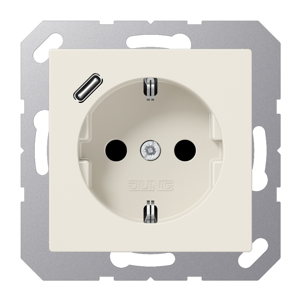 Jung SCHUKO Steckdose A1520-18C SCHUKO Steckdose mit 1 USB-Buchse Typ C, Berührungsschutz, Serie AS, weiß mit integriertem erhöhten Berührungsschutz mit 1 USB-Buchse Typ C mit Schnellladefunktion mit Federklemmen für starre Leiter bis 2,5 mm2 Verbindungsklemmen nach DIN VDE 0620 Montage in Gerätedose nach DIN 49073 Montagehinweis tiefe Dose (min. 60 mm) verwenden Material Thermoplast Hersteller Albrecht Jung GmbH & Co. KG EAN Nr. 4011377184237 Warengruppe Jung Serie AS