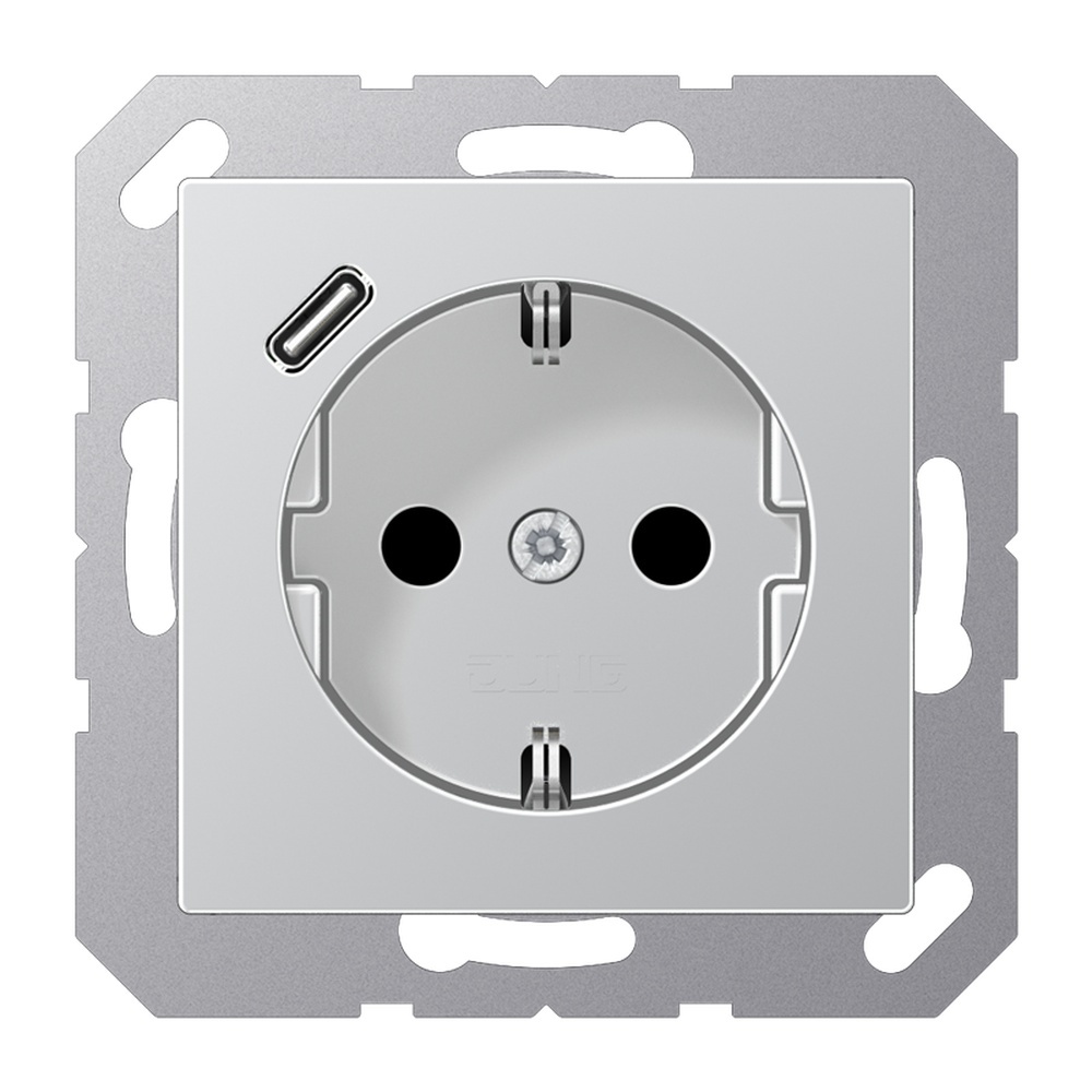 Jung SCHUKO Steckdose A1520-18CAL SCHUKO Steckdose mit 1 USB-Buchse Typ C, Berührungsschutz, Serie A, aluminium mit integriertem erhöhten Berührungsschutz mit 1 USB-Buchse Typ C mit Schnellladefunktion mit Federklemmen für starre Leiter bis 2,5 mm2 Verbindungsklemmen nach DIN VDE 0620 Montage in Gerätedose nach DIN 49073 Montagehinweis tiefe Dose (min. 60 mm) verwenden Material Thermoplast lackiert Hersteller Albrecht Jung GmbH & Co. KG EAN Nr. 4011377184275 Warengruppe Jung Serie A