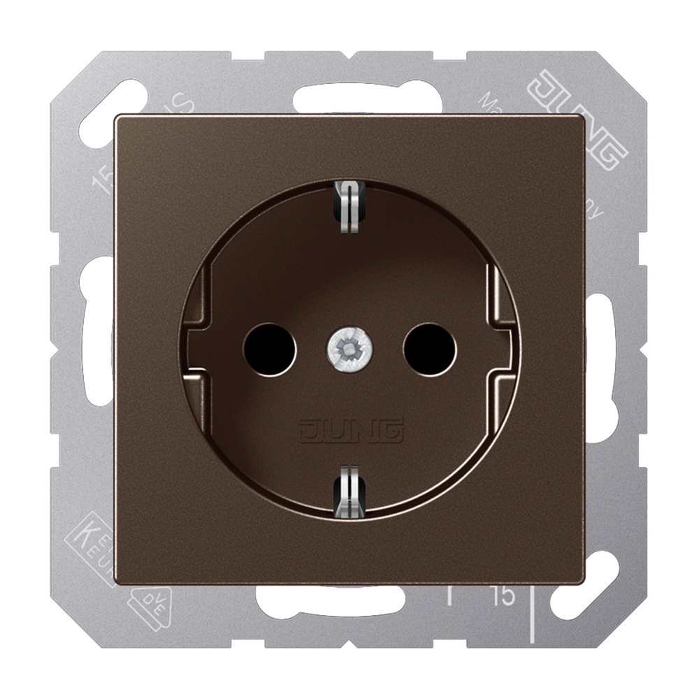 Jung SCHUKO Steckdose A1520NKIMO SCHUKO -Steckdose, 16 A 250 V ~, ohne Krallen, SAFETY+, Duroplast lackiert, Serie A, mokka SCHUKO -Steckdose, mokkamit integriertem erhöhten Berührungsschutz (Safety Plus)mit Federklemmen für starre und unbehandelte flexible Leiter bis 2,5 mm2Verbindungsklemmen nach DIN VDE 0620(Schraubbefestigung, ohne Befestigungskrallen)Tragring ist über eine Erdungsschiene in die Schutzmaßnahme eingebunden.Material: Duroplast lackiertMaße (BxH): 55 x 55 mm Hersteller Jung Nr. A1520NKIMO EAN Nr. 4011377112506 Warengruppe Jung Serie A