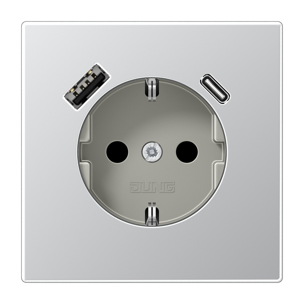 Jung SCHUKO Steckdose AL1520-15CA SCHUKO Steckdose 16 A 250 V ~, mit USB-Ladegerät 1xTyp A + 1xTyp C, SAFETY+, Serie LS, Aluminium mit integriertem erhöhten Berührungsschutz (Safety Plus) mit 1 USB-Buchse Typ A und 1 USB-Buchse Typ C mit Federklemmen für starre und unbehandelte flexible Leiter bis 2,5 mm2 Verbindungsklemmen nach DIN VDE 0620 Montage in Gerätedose mit Abmessungen nach DIN 49073 Tiefe der Gerätedose (Innenmaß): min. 57 mm Material: Aluminium AlMg1 Naturton, mattgebeizt Hersteller Jung EAN Nr. 4011377214064 Warengruppe Jung Serie LS