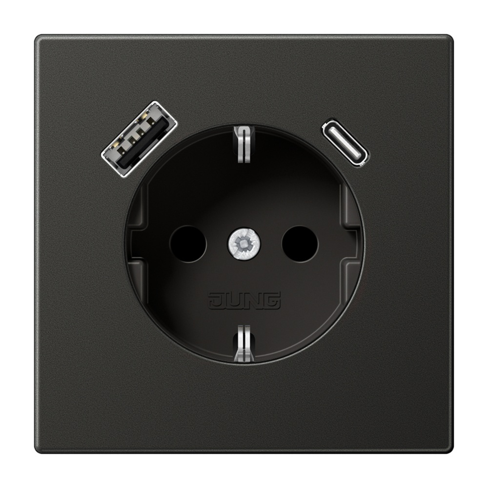 Jung SCHUKO Steckdose AL1520-15CAAN SCHUKO Steckdose 16 A 250 V ~, mit USB-Ladegerät 1xTyp A + 1xTyp C, SAFETY+, Serie LS, anthrazit mit integriertem erhöhten Berührungsschutz (Safety Plus) mit 1 USB-Buchse Typ A und 1 USB-Buchse Typ C mit Federklemmen für starre und unbehandelte flexible Leiter bis 2,5 mm2 Verbindungsklemmen nach DIN VDE 0620 Montage in Gerätedose mit Abmessungen nach DIN 49073 Tiefe der Gerätedose (Innenmaß): min. 57 mm Material: Aluminium lackiert Hersteller Jung EAN Nr. 4011377214088 Warengruppe Jung Serie LS