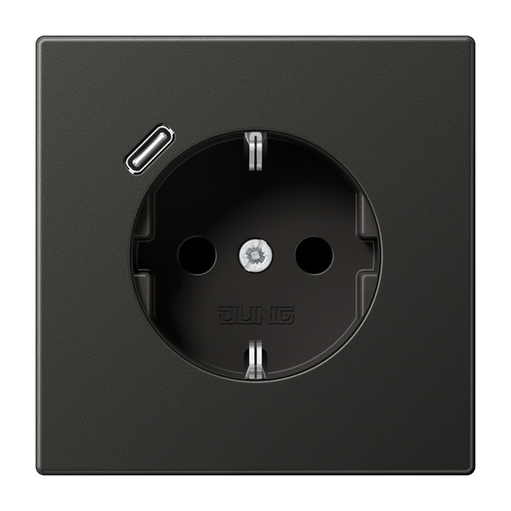 Jung SCHUKO Steckdose AL1520-18CAN SCHUKO Steckdose 16 A 250 V ~, mit USB-Ladegerät 1xTyp C, SAFETY+, Serie LS, anthrazit mit integriertem erhöhten Berührungsschutz (Safety Plus) mit 1 USB-Buchse Typ C mit Schnellladefunktion mit Federklemmen für starre und unbehandelte flexible Leiter bis 2,5 mm2 Verbindungsklemmen nach DIN VDE 0620 Montage in Gerätedose mit Abmessungen nach DIN 49073 Tiefe der Gerätedose (Innenmaß): min. 57 mm Material: Aluminium lackiert Hersteller Jung EAN Nr. 4011377214019 Warengruppe Jung Serie LS