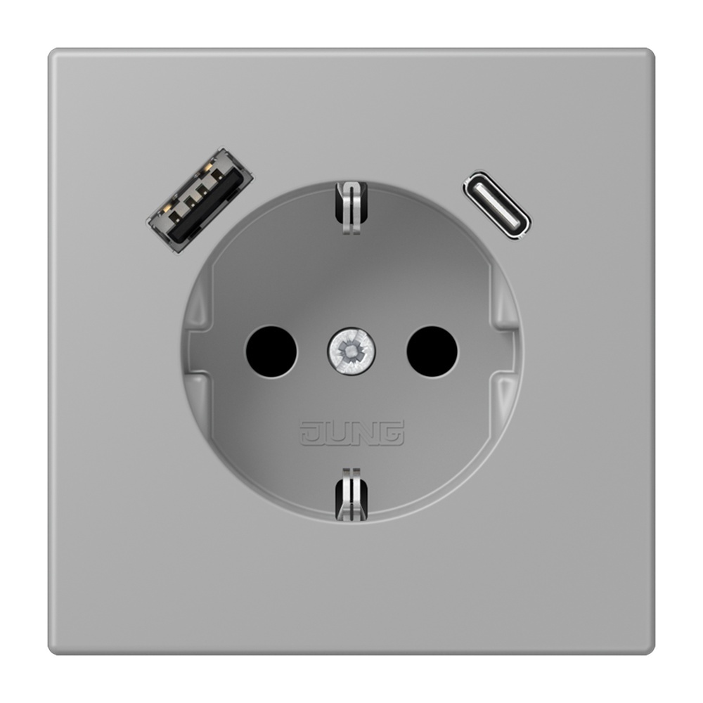 Jung SCHUKO Steckdose LC1520-15CA204 SCHUKO Steckdose 16 A 250 V, mit USB-Ladegerät 1xTyp A + 1xTyp C, SAFETY+, Serie LS, gris moyen (32012) mit integriertem erhöhten Berührungsschutz (Safety Plus) mit 1 USB-Buchse Typ A und 1 USB-Buchse Typ C mit Federklemmen für starre und unbehandelte flexible Leiter bis 2,5 mm2 Verbindungsklemmen nach DIN VDE 0620 Montage in Gerätedose mit Abmessungen nach DIN 49073 Tiefe der Gerätedose (Innenmaß): min. 57 mm Material: Thermoplast lackiert Hersteller Jung EAN Nr. 4011377285149 Warengruppe Jung Les Couleurs Le Corbusier