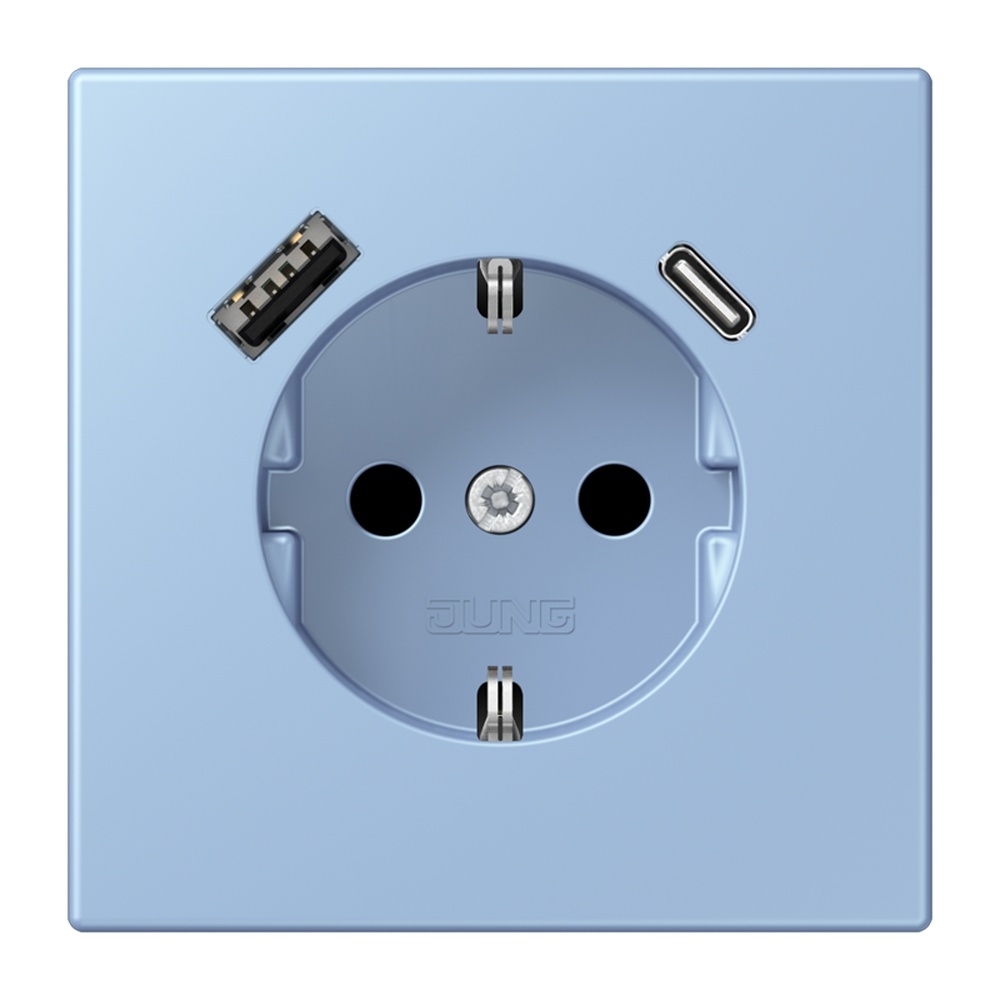 Jung SCHUKO Steckdose LC1520-15CA207 SCHUKO Steckdose 16 A 250 V, mit USB-Ladegerät 1xTyp A + 1xTyp C, SAFETY+, Serie LS, outremer moyen (32021) mit integriertem erhöhten Berührungsschutz (Safety Plus) mit 1 USB-Buchse Typ A und 1 USB-Buchse Typ C mit Federklemmen für starre und unbehandelte flexible Leiter bis 2,5 mm2 Verbindungsklemmen nach DIN VDE 0620 Montage in Gerätedose mit Abmessungen nach DIN 49073 Tiefe der Gerätedose (Innenmaß): min. 57 mm Material: Thermoplast lackiert Hersteller Jung EAN Nr. 4011377285170 Warengruppe Jung Les Couleurs Le Corbusier