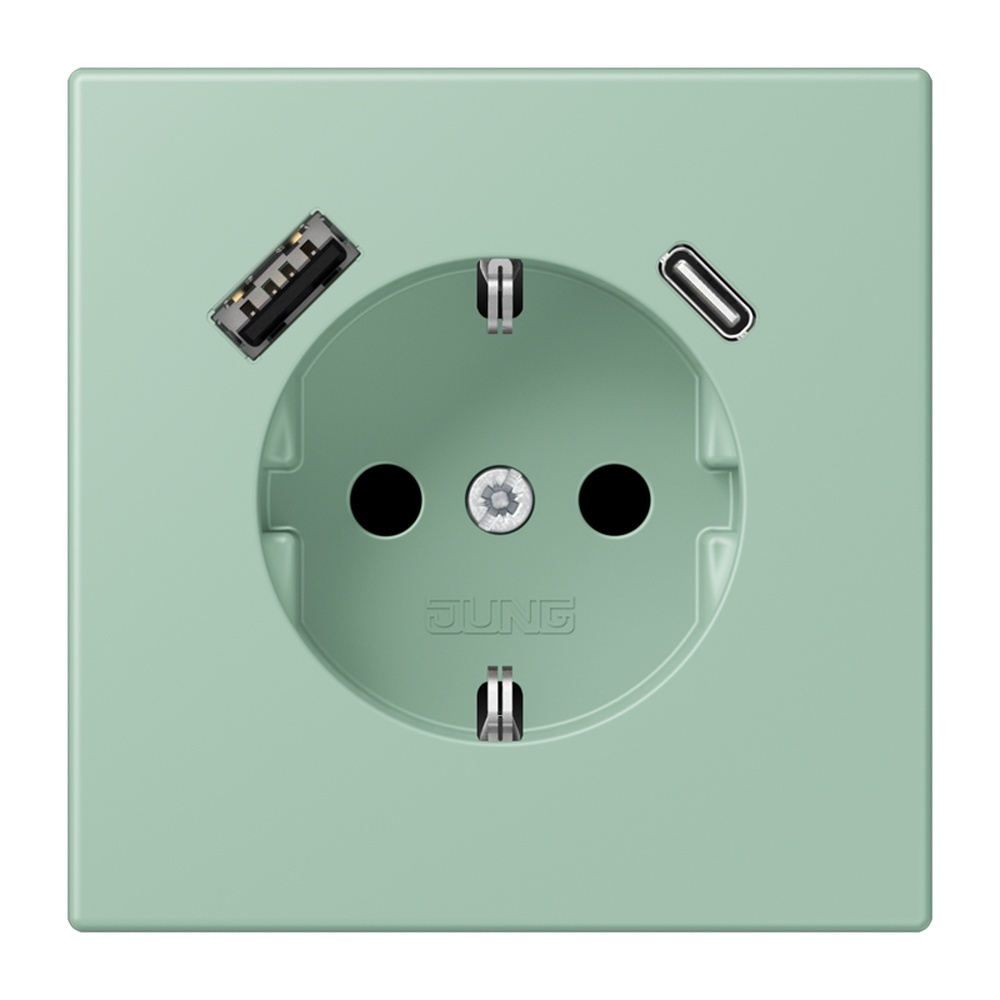 Jung SCHUKO Steckdose LC1520-15CA217 SCHUKO Steckdose 16 A 250 V, mit USB-Ladegerät 1xTyp A + 1xTyp C, SAFETY+, Serie LS, vert anglais clair (32041) mit integriertem erhöhten Berührungsschutz (Safety Plus) mit 1 USB-Buchse Typ A und 1 USB-Buchse Typ C mit Federklemmen für starre und unbehandelte flexible Leiter bis 2,5 mm2 Verbindungsklemmen nach DIN VDE 0620 Montage in Gerätedose mit Abmessungen nach DIN 49073 Tiefe der Gerätedose (Innenmaß): min. 57 mm Material: Thermoplast lackiert Hersteller Jung EAN Nr. 4011377285279 Warengruppe Jung Les Couleurs Le Corbusier