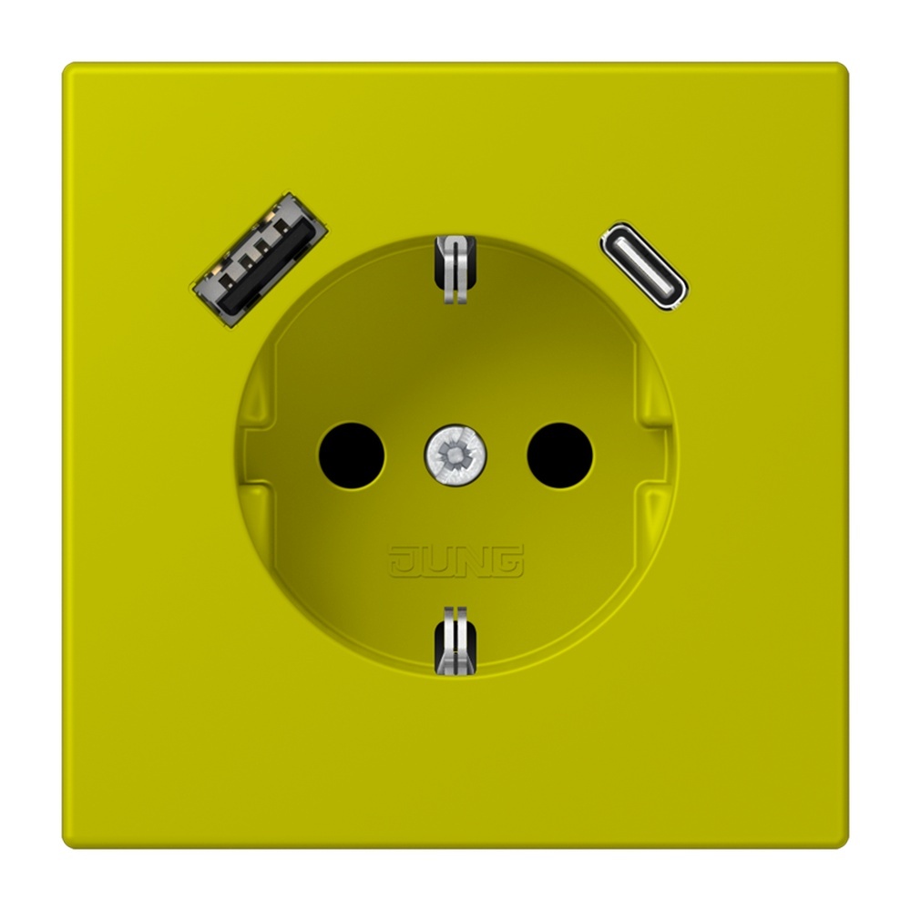 Jung SCHUKO Steckdose LC1520-15CA249 SCHUKO Steckdose 16 A 250 V, mit USB-Ladegerät 1xTyp A + 1xTyp C, SAFETY+, Serie LS, vert olive vif (4320F) mit integriertem erhöhten Berührungsschutz (Safety Plus) mit 1 USB-Buchse Typ A und 1 USB-Buchse Typ C mit Federklemmen für starre und unbehandelte flexible Leiter bis 2,5 mm2 Verbindungsklemmen nach DIN VDE 0620 Montage in Gerätedose mit Abmessungen nach DIN 49073 Tiefe der Gerätedose (Innenmaß): min. 57 mm Material: Thermoplast lackiert Hersteller Jung EAN Nr. 4011377285590 Warengruppe Jung Les Couleurs Le Corbusier