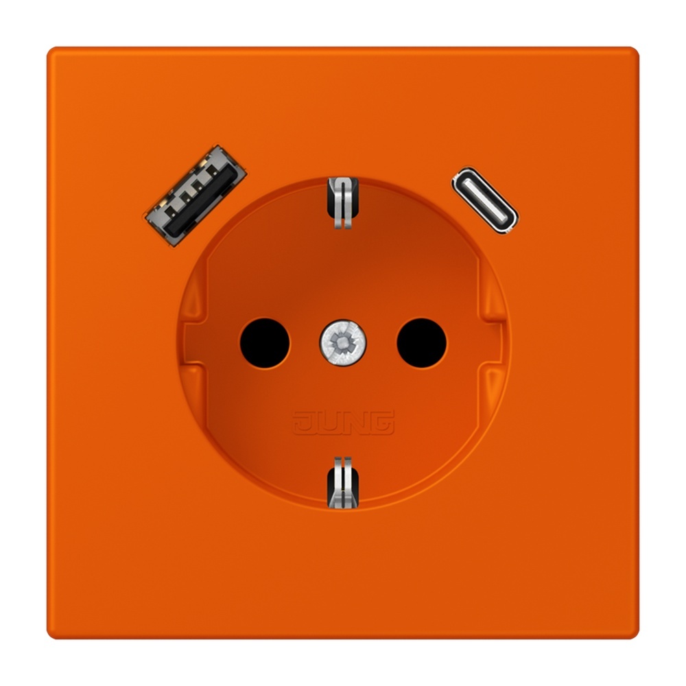 Jung SCHUKO Steckdose LC1520-15CA260 SCHUKO Steckdose 16 A 250 V, mit USB-Ladegerät 1xTyp A + 1xTyp C, SAFETY+, Serie LS, orange vif (4320S) mit integriertem erhöhten Berührungsschutz (Safety Plus) mit 1 USB-Buchse Typ A und 1 USB-Buchse Typ C mit Federklemmen für starre und unbehandelte flexible Leiter bis 2,5 mm2 Verbindungsklemmen nach DIN VDE 0620 Montage in Gerätedose mit Abmessungen nach DIN 49073 Tiefe der Gerätedose (Innenmaß): min. 57 mm Material: Thermoplast lackiert Hersteller Jung EAN Nr. 4011377285712 Warengruppe Jung Les Couleurs Le Corbusier