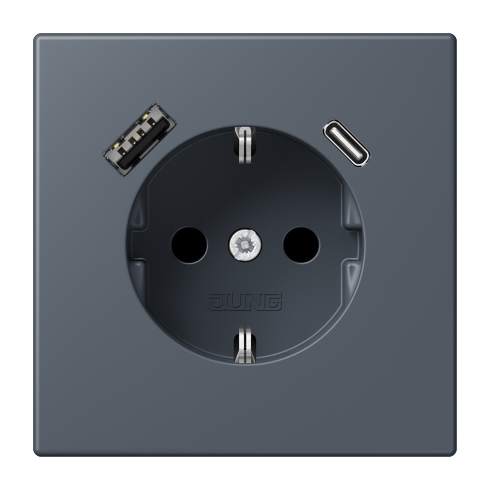 Jung SCHUKO Steckdose LC1520-15CA262 SCHUKO Steckdose 16 A 250 V, mit USB-Ladegerät 1xTyp A + 1xTyp C, SAFETY+, Serie LS, gris foncé 59 (4320U) mit integriertem erhöhten Berührungsschutz (Safety Plus) mit 1 USB-Buchse Typ A und 1 USB-Buchse Typ C mit Federklemmen für starre und unbehandelte flexible Leiter bis 2,5 mm2 Verbindungsklemmen nach DIN VDE 0620 Montage in Gerätedose mit Abmessungen nach DIN 49073 Tiefe der Gerätedose (Innenmaß): min. 57 mm Material: Thermoplast lackiert Hersteller Jung EAN Nr. 4011377285736 Warengruppe Jung Les Couleurs Le Corbusier