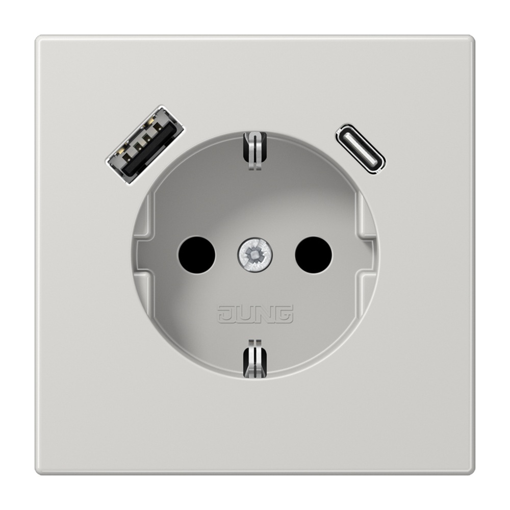 Jung SCHUKO Steckdose LS1520-15CALG SCHUKO Steckdose mit 1 USB-Buchse Typ A und 1 USB-Buchse Typ C, Berührungsschutz, Serie LS, lichtgrau mit integriertem erhöhten Berührungsschutz mit 1 USB-Buchse Typ A und 1 USB-Buchse Typ C mit Federklemmen für starre Leiter bis 2,5 mm2 Verbindungsklemmen nach DIN VDE 0620 Montage in Gerätedose nach DIN 49073 Montagehinweis tiefe Dose (min. 60 mm) verwenden Material Thermoplast Hersteller Albrecht Jung GmbH & Co. KG EAN Nr. 4011377184664 Warengruppe Jung Serie LS