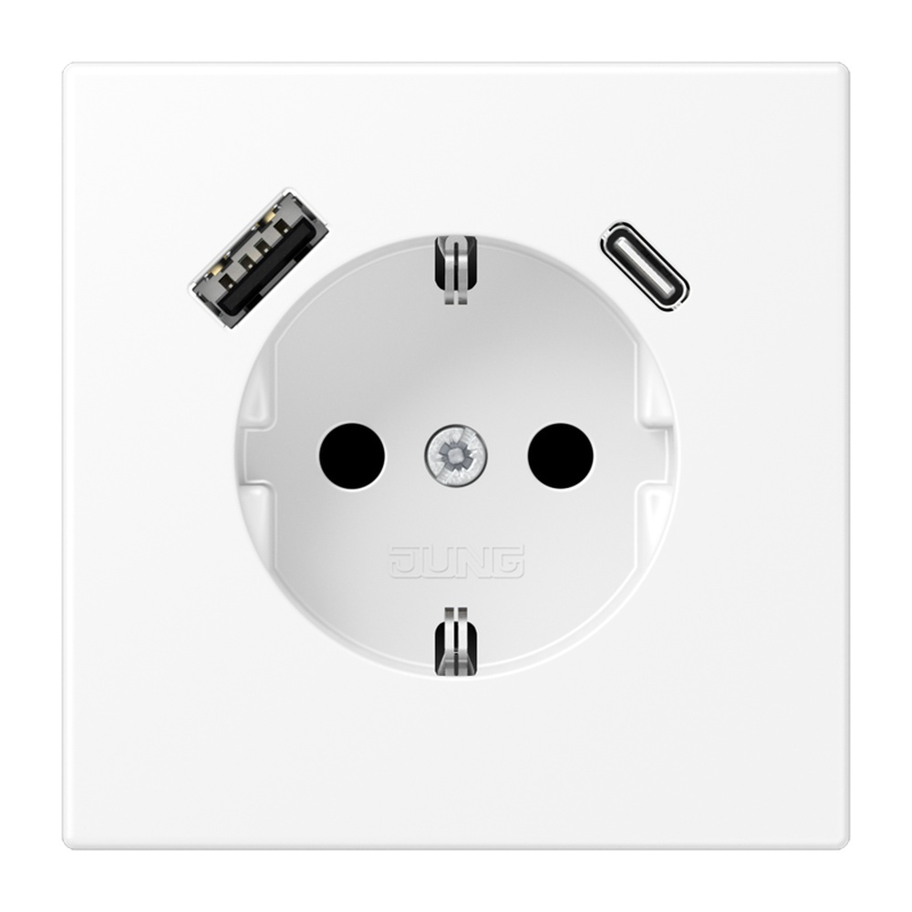 Jung SCHUKO Steckdose LS1520-15CAWWM SCHUKO Steckdose mit 1 USB-Buchse Typ A und 1 USB-Buchse Typ C, Berührungsschutz, Serie LS, schneeweiß matt mit integriertem erhöhten Berührungsschutz mit 1 USB-Buchse Typ A und 1 USB-Buchse Typ C mit Federklemmen für starre Leiter bis 2,5 mm2 Verbindungsklemmen nach DIN VDE 0620 Montage in Gerätedose nach DIN 49073 Montagehinweis tiefe Dose (min. 60 mm) verwenden Material Thermoplast lackiert Hersteller Albrecht Jung GmbH & Co. KG EAN Nr. 4011377187634 Warengruppe Jung Serie LS