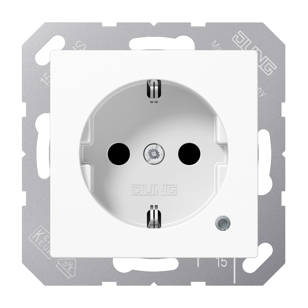 Jung SCHUKO Steckdose SPA1520NXKOWW SCHUKO Steckdose, 16 A 250 V ~, ohne Krallen, mit Funktionsanzeige, SAFETY+, mit nicht geerdetem Tragring, Duroplast antimikrobiell, Serie AS, alpinwe mit Funktionsanzeige (grüne LED) Art.-Nr.: 193-LED GN (nach DIN VDE 0100 Teil 710.55.3) mit integriertem erhöhten Berührungsschutz (Safety Plus) mit Federklemmen für starre und unbehandelte flexible Leiter bis 2,5 mm2 Verbindungsklemmen nach DIN VDE 0620 mit nicht geerdetem Tragring (Schraubbefestigung, ohne Befestigungskrallen) Funktionsanzeige ohne Spannungsunterbrechung von vorne austauschbar Material: Duroplast antimikrobiell Maße (BxH): 55 x 55 mm Hersteller Jung EAN Nr. 4011377215344 Warengruppe Jung Serie AS