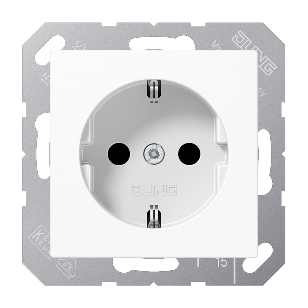 Jung SCHUKO Steckdose SPA1520WW SCHUKO Steckdose, 16 A 250 V ~, Duroplast antimikrobiell, Serie AS, alpinweiß SCHUKO -Steckdose, alpinweiß mit Federklemmen für starre und unbehandelte flexible Leiter bis 2,5 mm2 Verbindungsklemmen nach DIN VDE 0620 Tragring, Krallen und Krallenschrauben sind über eine Erdungsschiene in die Schutzmaßnahme eingebunden. Material: Duroplast antimikrobiell Maße (BxH): 55 x 55 mm Hersteller Jung EAN Nr. 4011377215313 Warengruppe Jung Serie AS