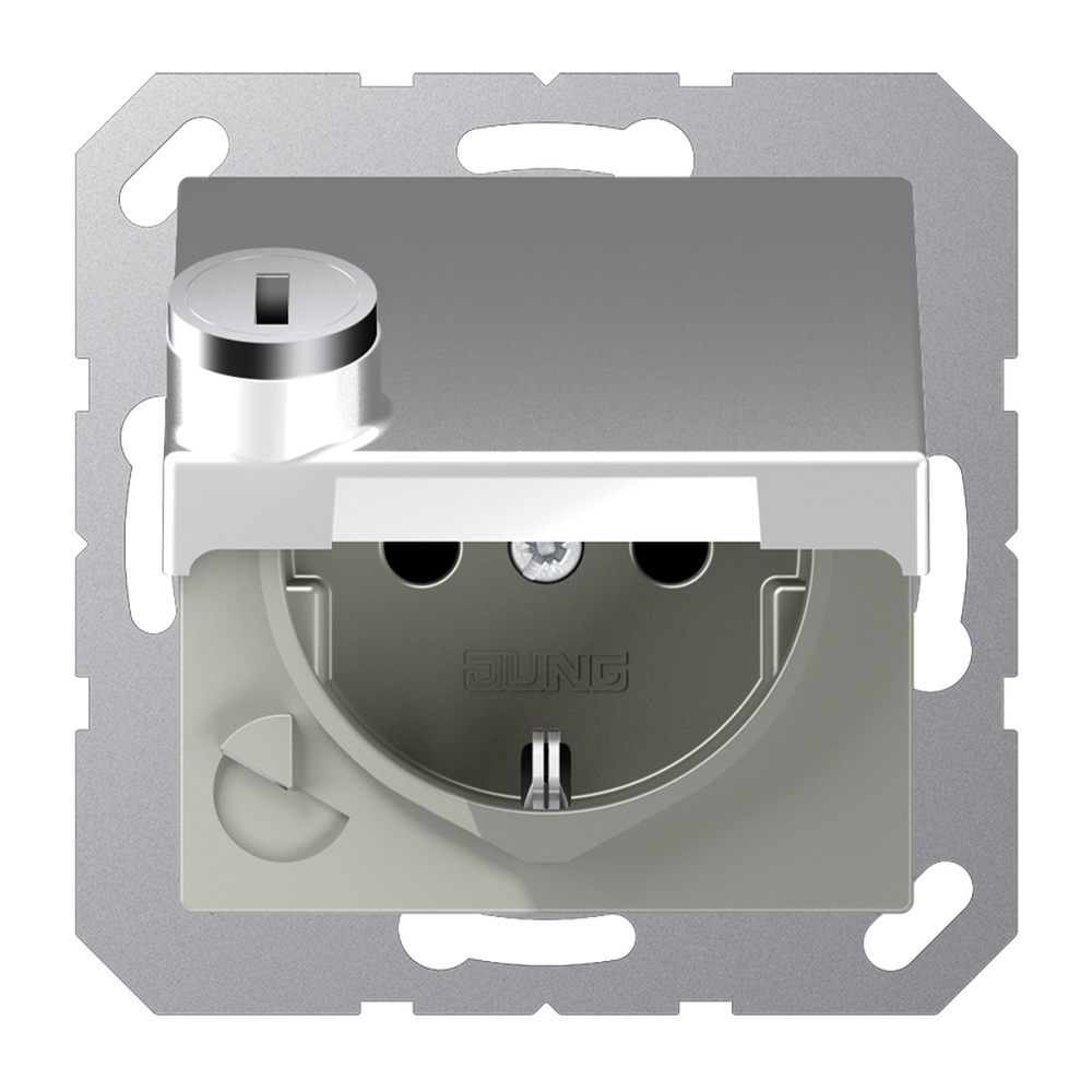 Jung Schutzkontakt Steckdose A 1520 BFKLSL AL SCHUKO-Steckdose, 16 A 250 V ~, mit Klappdeckel mit Rückstellfeder und Sicherheitsschloss 24 verschiedene Schließungen, bruchsicher, mit Federklemmen für starre Leiter bis 2,5 mm² Hersteller Albrecht Jung GmbH & Co. KG Typ A1520BFKLSLAL EAN Nr. 4011377132689 Warengruppe Jung Serie A