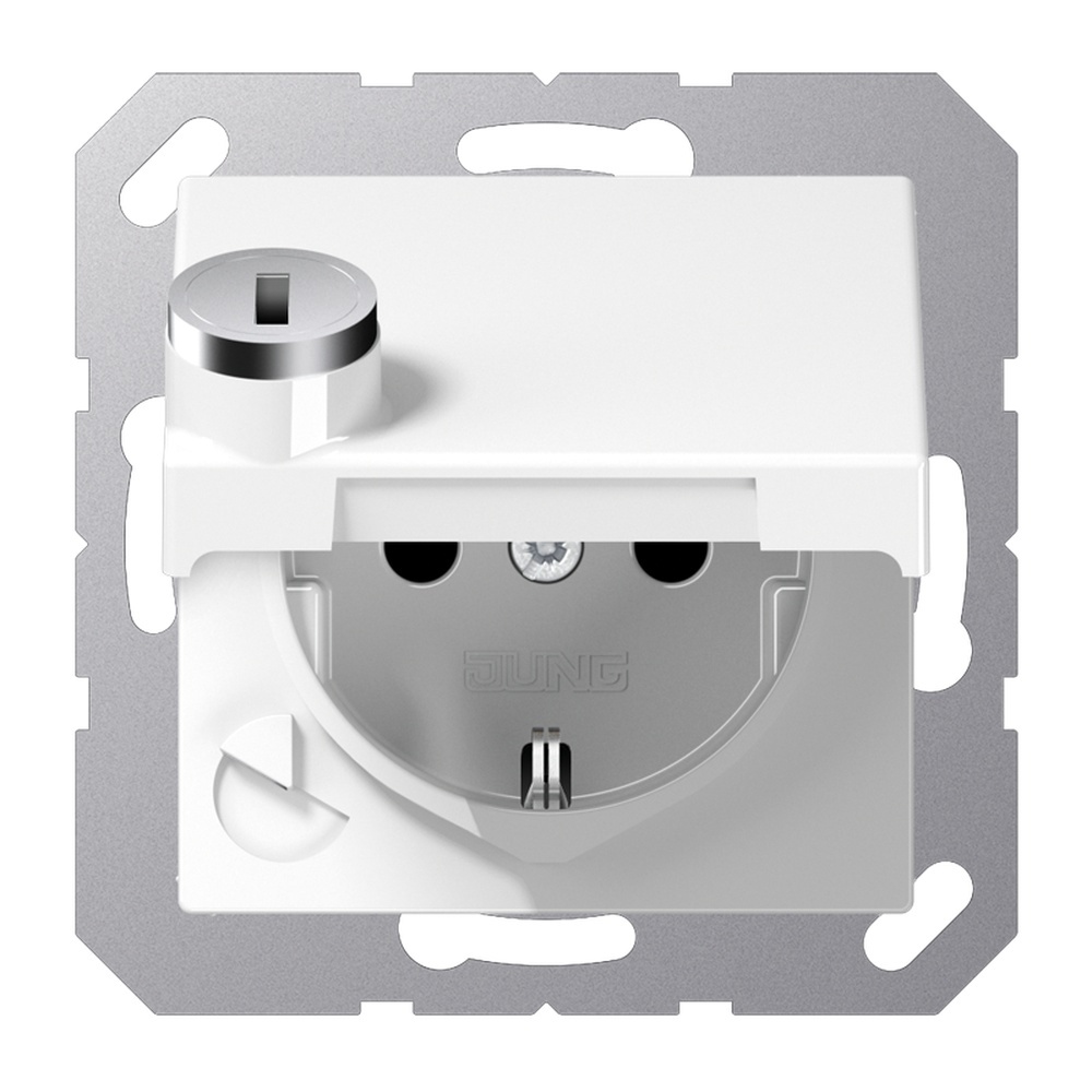 Jung Schutzkontakt Steckdose A 1520 BFKLSL WW SCHUKO-Steckdose, 16 A 250 V ~, mit Klappdeckel mit Rückstellfeder und Sicherheitsschloss 24 verschiedene Schließungen, bruchsicher, mit Federklemmen für starre Leiter bis 2,5 mm² Hersteller Albrecht Jung GmbH & Co. KG Typ A1520BFKLSLWW EAN Nr. 4011377132726 Warengruppe Jung Serie A