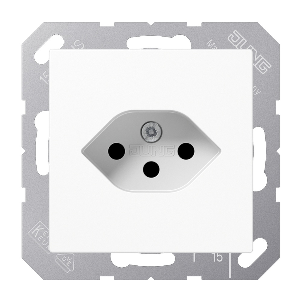 Jung SEV Steckdose A 1520-13 BF SEV WW Steckdose, 10 A, 250 V ~, L, N und PE, mit Tragring, Schraubbefestigung, Schweizer Norm, Typ 13, mit Federklemmen für starre Leiter bis 2,5 mm², für Einbau in Gerätedose nach DIN 49 073 Hersteller Albrecht Jung GmbH & Co. KG Typ A1520-13BFSEVWW EAN Nr. 4011377102477 Warengruppe Jung Serie A