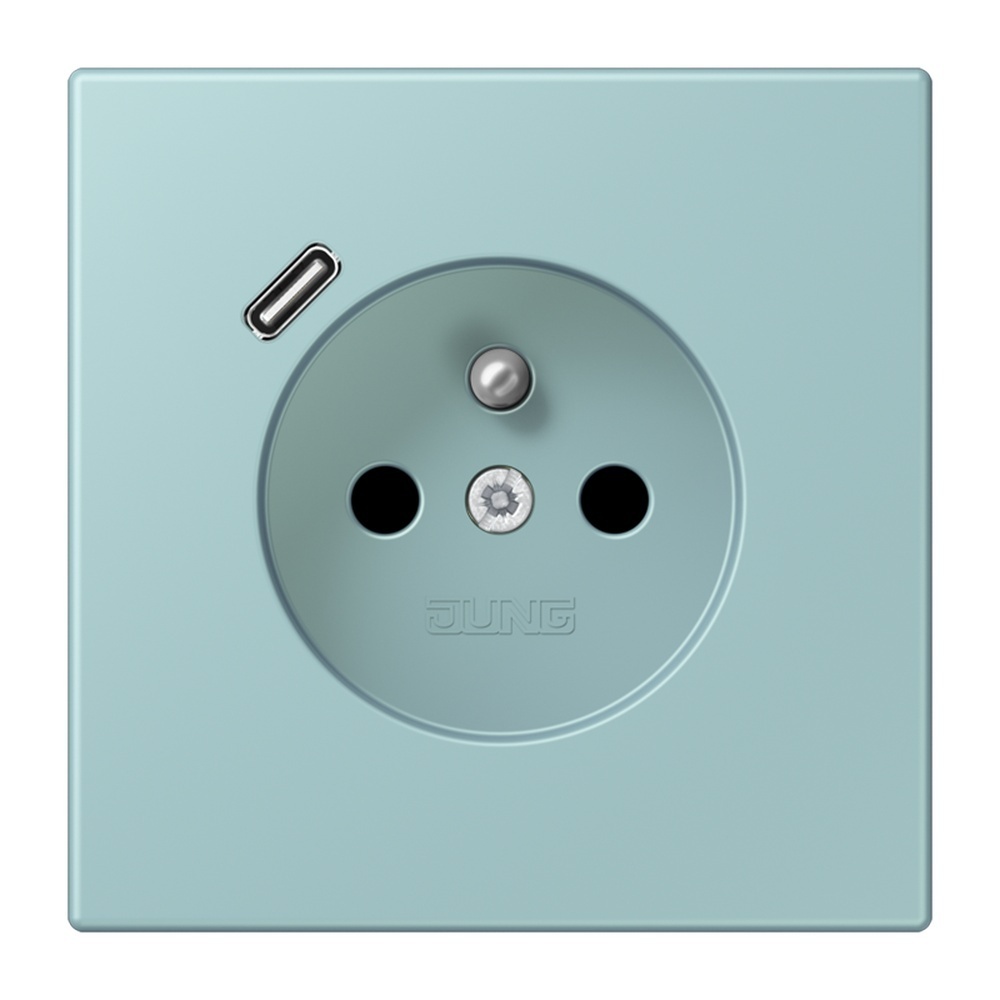 Jung Steckdose LC1520F-18C214 Steckdose, französisch/belgisches System 16 A 250 V ~, mit USB-Ladegerät 1xTyp C, SAFETY+, Serie LS, céruléen clair (32033) 2-polig mit Erdungsstift, 16 A 250 V ~CEE 7/5mit integriertem erhöhten Berührungsschutz (Safety Plus)mit 1 USB-Buchse Typ Cmit Schnellladefunktion (JUNG Quick Charge )mit Federklemmen für starre und unbehandelte flexible Leiter bis 2,5 mm2Verbindungsklemmen nach DIN VDE 0620Montage in Gerätedose mit Abmessungen nach DIN 49073Tiefe der Gerätedose (Innenmaß): min. 57 mmMaterial: Thermoplast lackiert Hersteller Jung Nr. LC1520F-18C214 EAN Nr. 4011377341579 Warengruppe Jung Serie LS